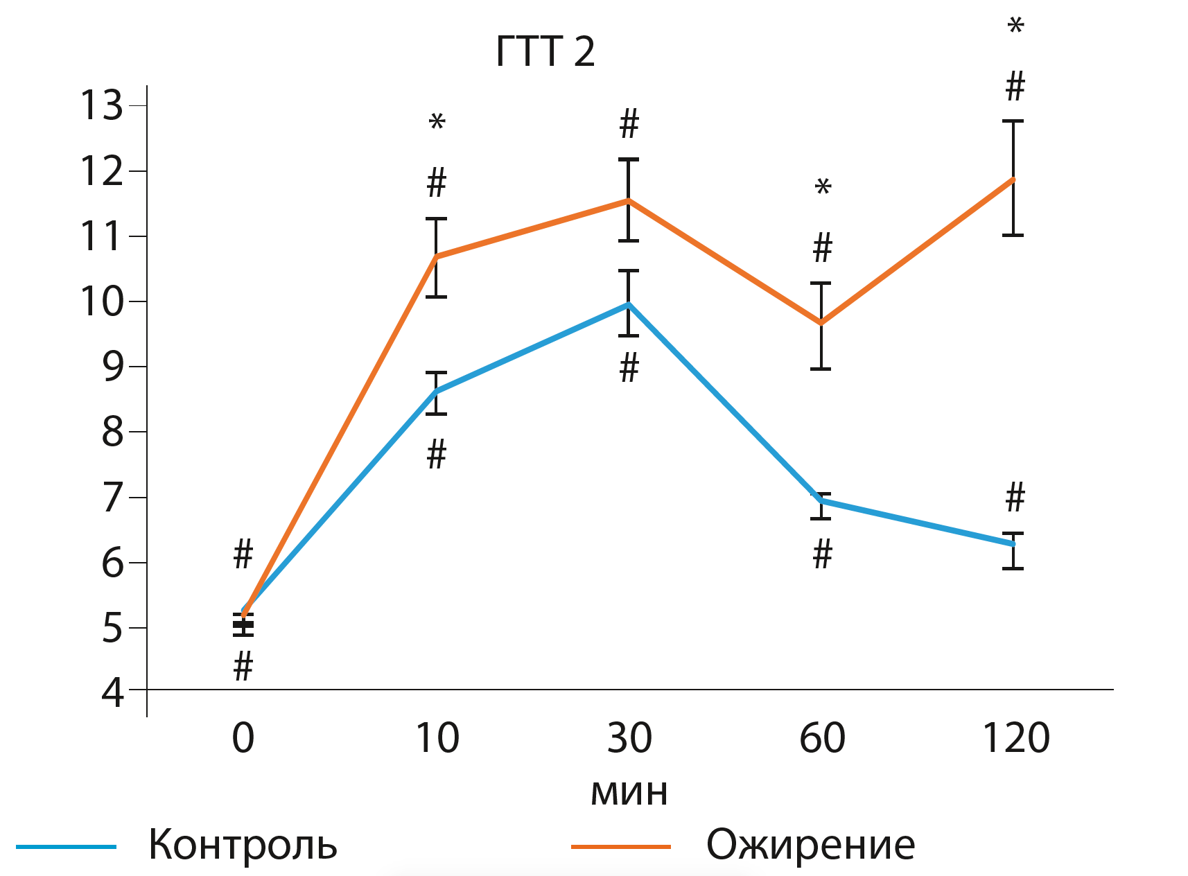 Примечания: по оси ординат: концентрация глюкозы (ммоль/л), по оси абсцисс: «0 мин» – до введения глюкозы, остальные точки соответствуют промежуткам времени после внутрибрюшинного введения глюкозы. # – значимые различия по сравнению с точкой «0 мин» при р≤0,023 у группы «контроль» и р≤0,037 у группы «ожирение»