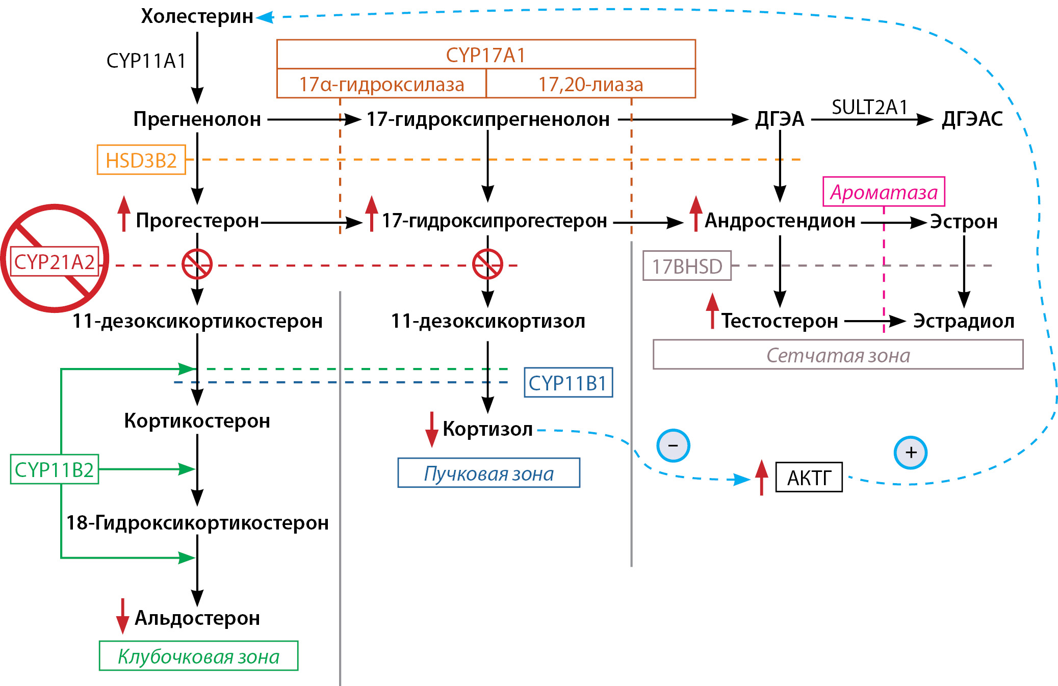 Недостаточность фермента 21-гидроксилазы является аутосомно-рецессивным заболеванием, ответственным за 95% всех случаев врожденной дисфункции коры надпочечников (ВДКН) [1, 2]. Фермент 21-гидроксилаза катализирует синтез 11-дезоксикортикостерона из прогестерона и 11-дезоксикортизола из 17-гидроксипрогестерона (17OHP), которые в ходе дальнейших реакций превращаются в альдостерон и кортизол соответственно, в связи с чем снижение активности данного фермента вызывает нарушение синтеза как глюко- (ГК), так и минералокортикоидов (МК) [1]. Нарушение синтеза кортизола приводит к снижению его воздействия на аденогипофиз по отрицательной обратной связи и, следовательно, увеличению секреции адренокортикотропного гормона (АКТГ), стимулирующего выработку продуктов стероидогенеза выше ферментативного блока: 17OHP, прогестерона и надпочечниковых андрогенов – андростендиона и тестостерона (рис. 1) [2]. Повышение продукции последних приводит к гиперандрогении, выражающейся в нарушении полового развития и гирсутизме у девочек и преждевременном половом созревании, снижении конечного роста и фертильности у обоих полов [3]. Вирилизация наружных половых органов является основным проявлением классических форм ВДКН у новорожденных девочек. В случае позднего начала лечения и у мужчин, и у женщин наблюдаются ускорение роста и раннее половое созревание, а выраженная сольтеряющая форма может приводить к фатальному исходу [4].