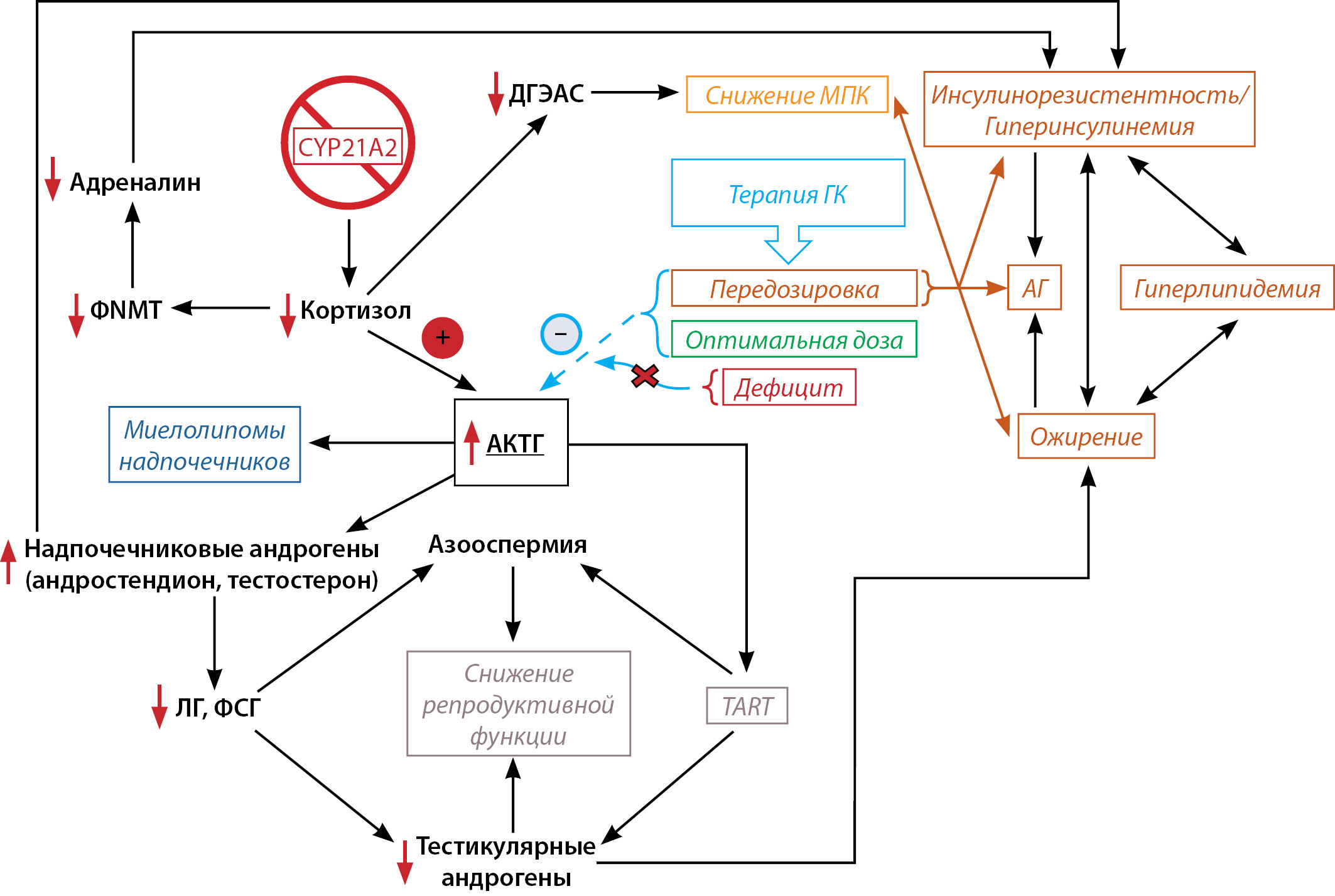 2. Рисунок 2. Патогенез поздних осложнений и неадекватного лечения недостаточности 21-гидроксилазы у мужчин: АКТГ – адренокортикотропный гормон; ГК – глюкокортикоиды; ФNМТ – фенилэтаноламин-N-метилтрансфераза; TART – опухоли яичек из остаточной надпочечниковой ткани (от англ. testicular adrenal rest tumors); АГ – артериальная гипертензия; МПК – минеральная плотность костной ткани; ЛГ – лютеинизирующий гормон; ФСГ – фолликулостимулирующий гормон.
