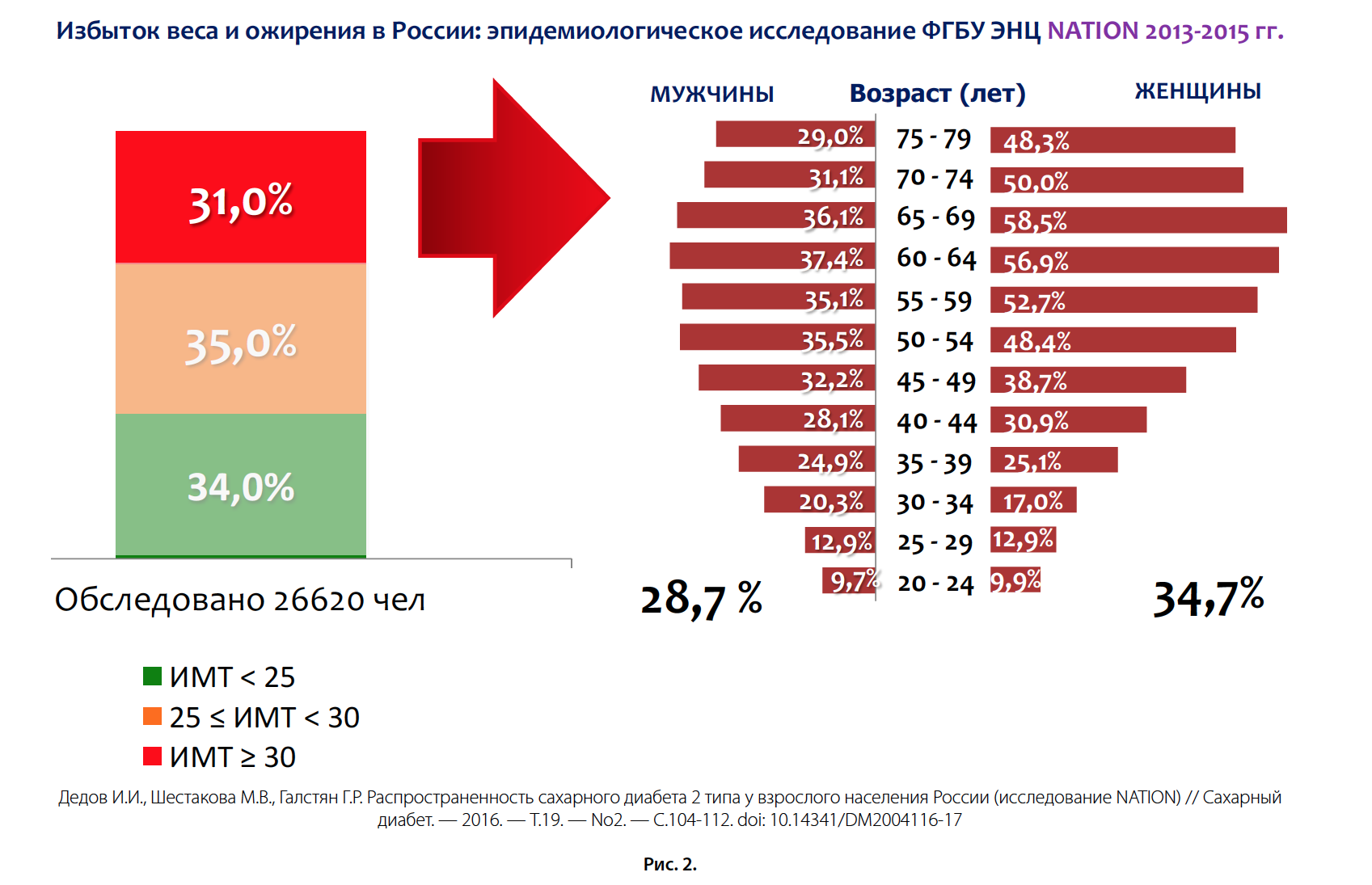 В 2013–2015 гг на территории Российской Федерации было проведено эпидемиологическое исследование NATION, включавшее 26620 человек, целью которого было провести скрининг населения на ранее не выявленный сахарный диабет 2 типа (СД2) и оценить образ жизни людей (характер питания и физических нагрузок) по специально разработанным опросникам. По результатам исследования оказалось, что 31% россиян имеют ожирение (27.7% мужчин и 39,7% женщин).