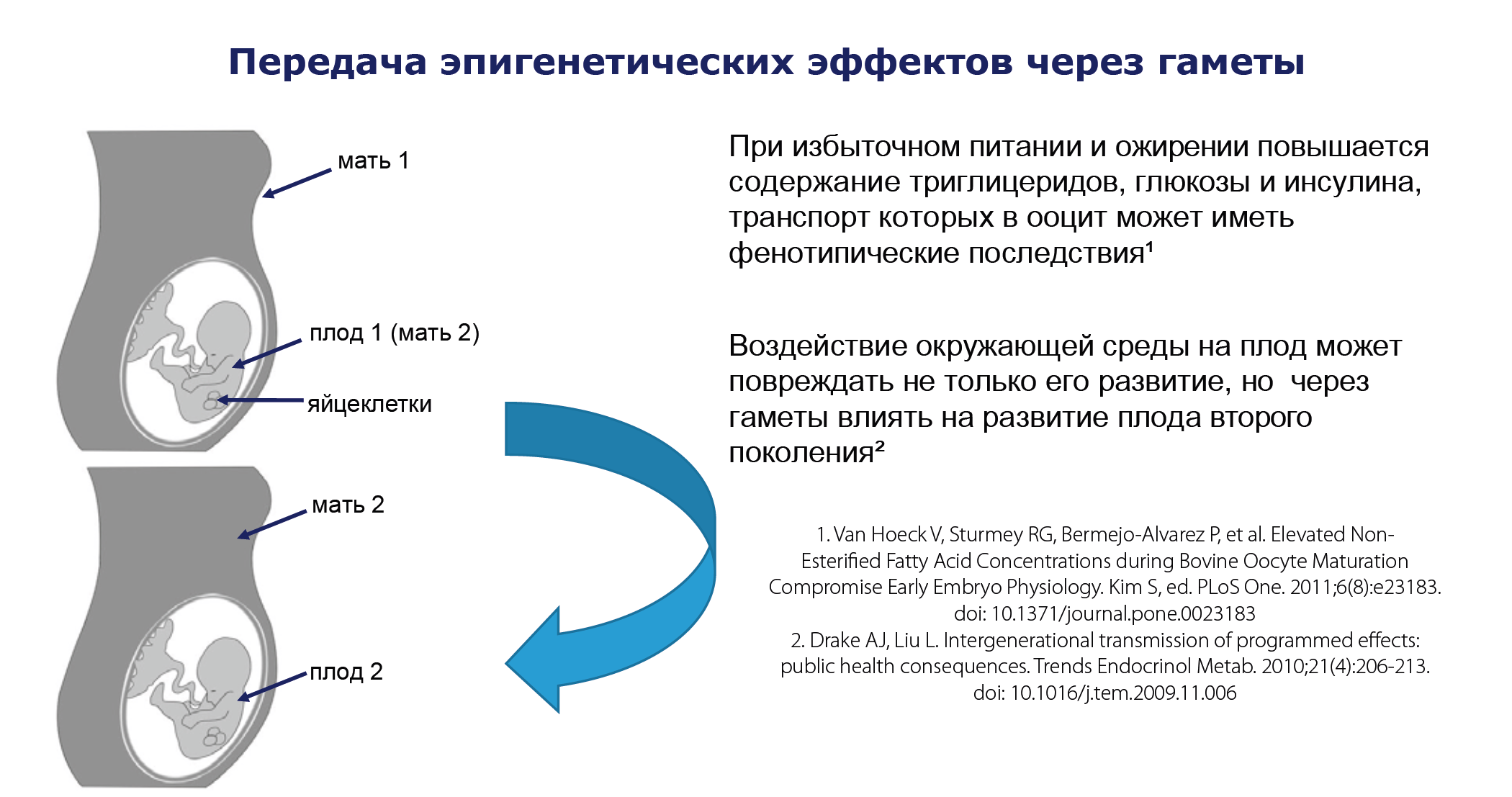 Как переедание, так и дефицит макронутриентов уже внутриутробно влияют на формирование метаболизма будущего человека, повышая риск таких заболеваний как ожирение, сахарный диабет 2 типа (СД-2), артериальная гипертензия (АГ). При избыточном питании и ожирении матери повышается содержание триглицеридов, глюкозы и инсулина, транспорт которых в ооцит плода может иметь фенотипические последствия для будущих поколений.