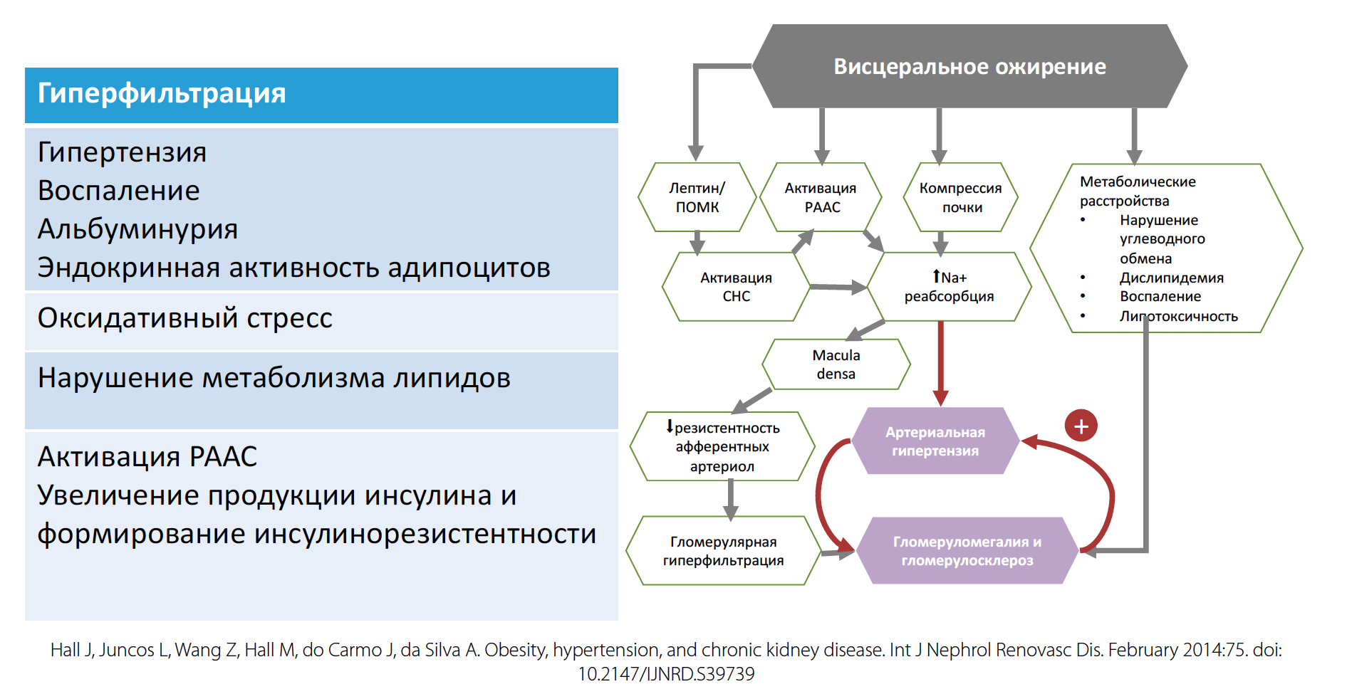 Среди значимых факторов риска почечной дисфункции – наряду с сахарным диабетом и артериальной гипертензией – ассоциированное с ними ожирение. Возможные механизмы развития почечной патологии при ожирении включают гемодинамические, метаболические, провоспалительные, гормональные изменения.