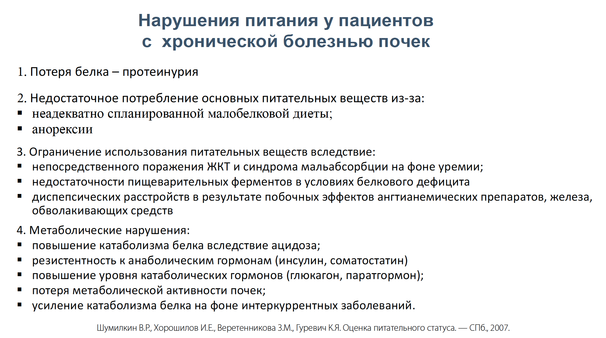 Для оценки состояния питания используют четыре группы методов: соматометрические, лабораторные, клинические, функциональные. Прогрессирующая ХБП ведет к изменению протеинового и энергетического гомеостазиса, нарушению катаболизма протеинов, расстройству кислотно-щелочного обмена, гормональной дисфункции. Персистирующий высокий уровень мочевины– маркер уремии – может повышать карбомилирование белков и генерировать активные формы кислорода, приводящие к окислительному стрессу, воспалению, эндотелиальной дисфункции и, в конечном итоге, сердечно-сосудистым заболеваниям.
