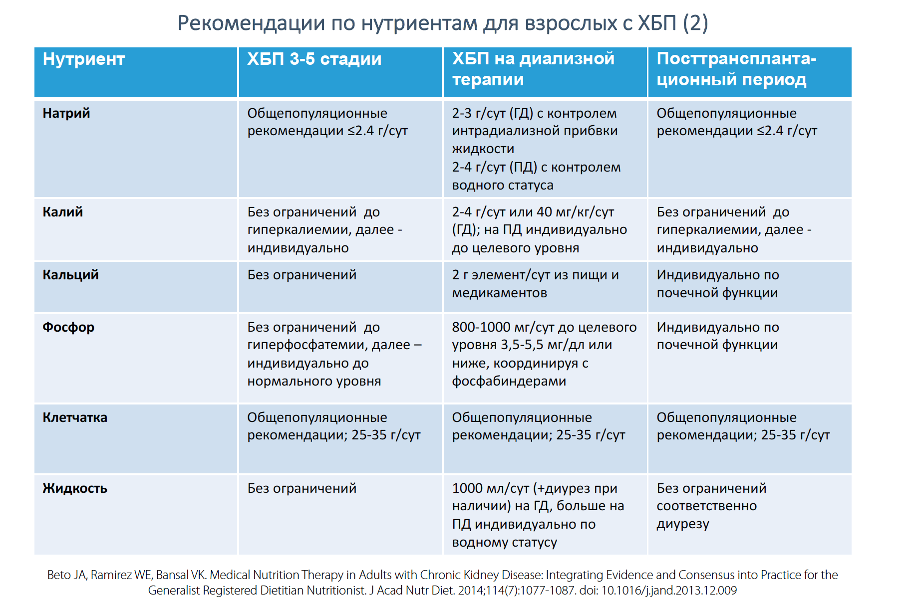 Объединенные рекомендации Национального почечного фонда США и Американской диетологической ассоциации («Академия питания и диеты») включают позиции по адаптивному потреблению основных нутриентов и электролитов (рис. 13, 14).