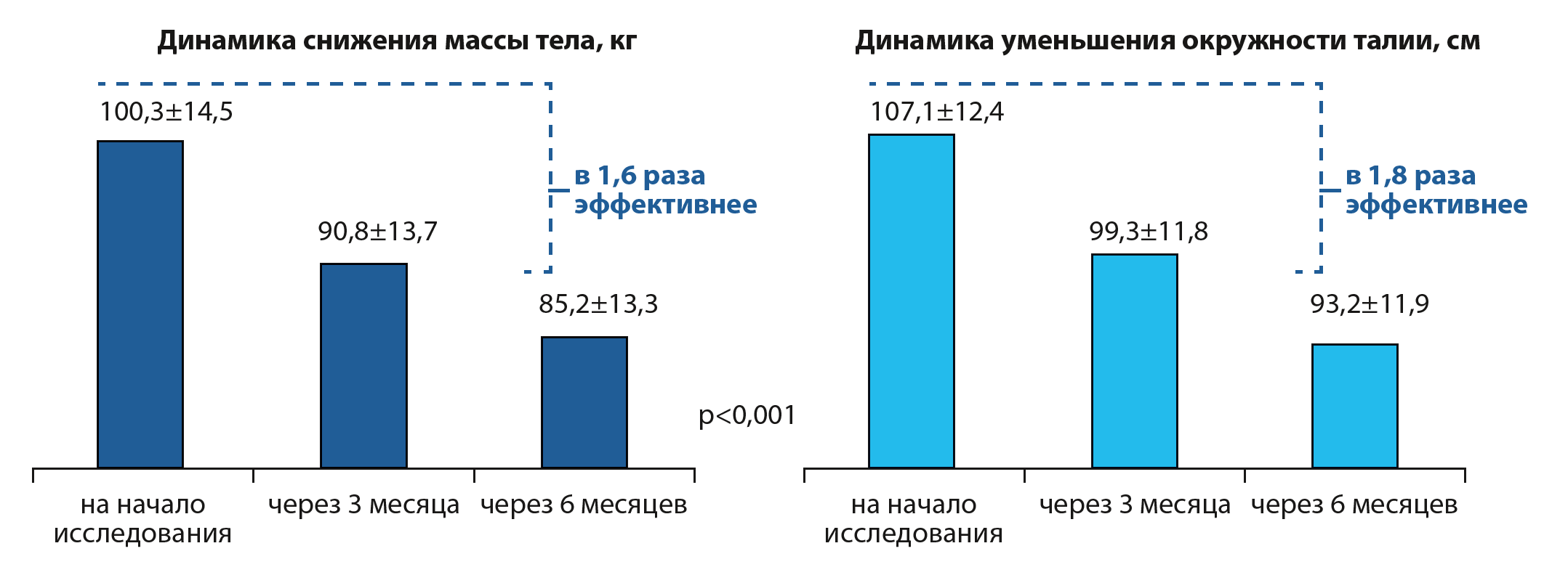 Results: The “AVRORA” study was attended by 259 doctors and 5,812 patients in 240 medical institutions from 12 cities of the Russian Federation. The average age of patients was 46.6 ± 10.5 years, the ratio of male / female -24% / 76%. The decreasing of BMI during 6 months of the therapy amounted to 5.4 ± 2.3 kg / m2 (on average, 15.1 ± 6.4 kg). After 3 months of the therapy 81.6% of patients achieved clinically significant weight loss of 10.6% or more. The average decrease in waist circumference during 6 months of therapy was 13.8 ± 7.4 cm. A decrease of indicators of glycemic control and lipid metabolism right up to the target values was observed.