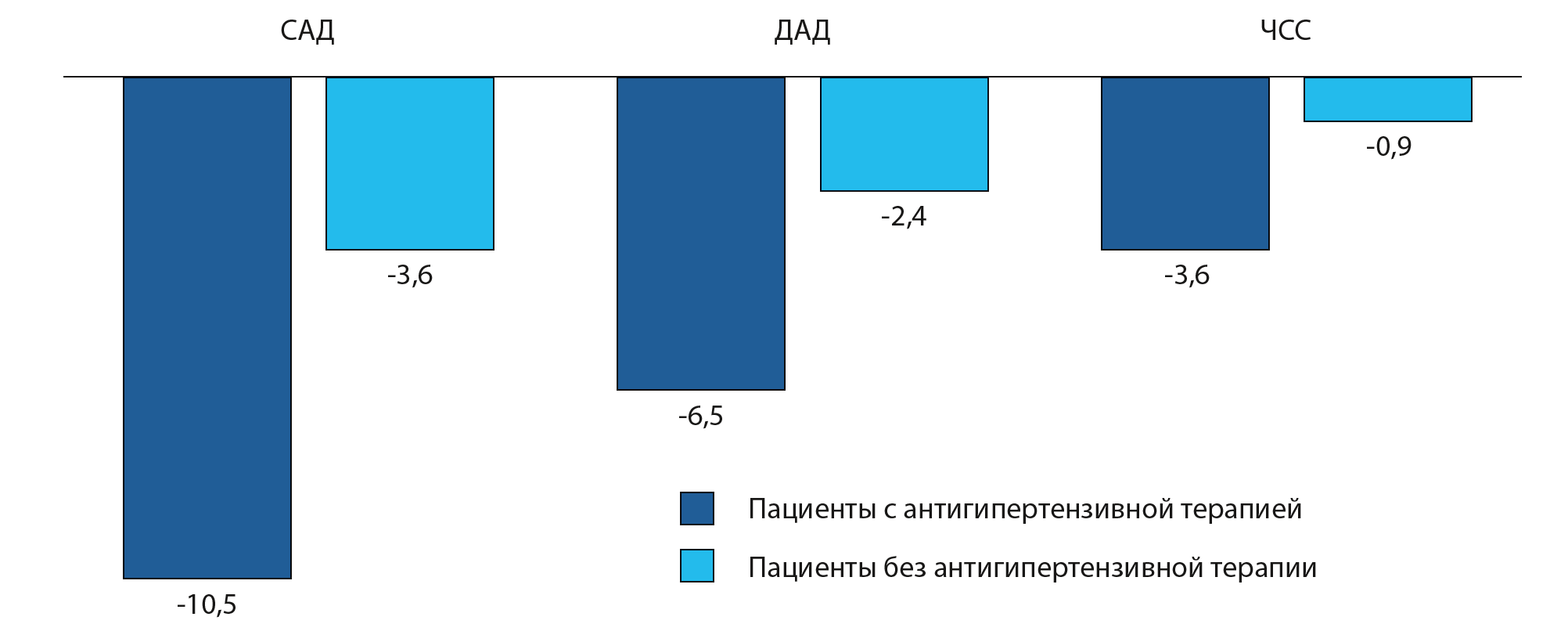 6. Fig. 6. Dynamics of indicators of the cardiovascular system in patients receiving and not receiving concomitant antihypertensive therapy, during therapy with the drug Reduxin®Met. | |