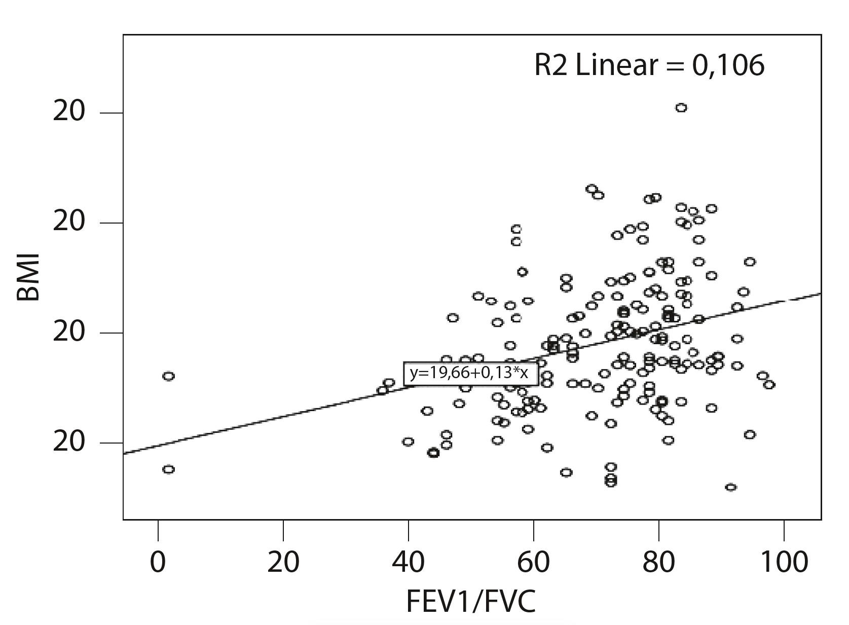 Бронхиальная астма контролировалась у 20 (11,3%) пациентов из 177, при этом 9 (45%), 10 (50%) и 1 (5%) из них страдали легкой, умеренной и тяжелой астмой соответственно. Согласно коэффициенту корреляции Пирсона, установлена положительная и достоверная корреляция между значениями ИМТ и ОФВ1/ЖЕЛ (r=0,32 и p=0,0001) (рис. 1). Однако значимой корреляции между значениями ОФВ1 и ИМТ выявлено не было (r=0,13 и p=0,06).