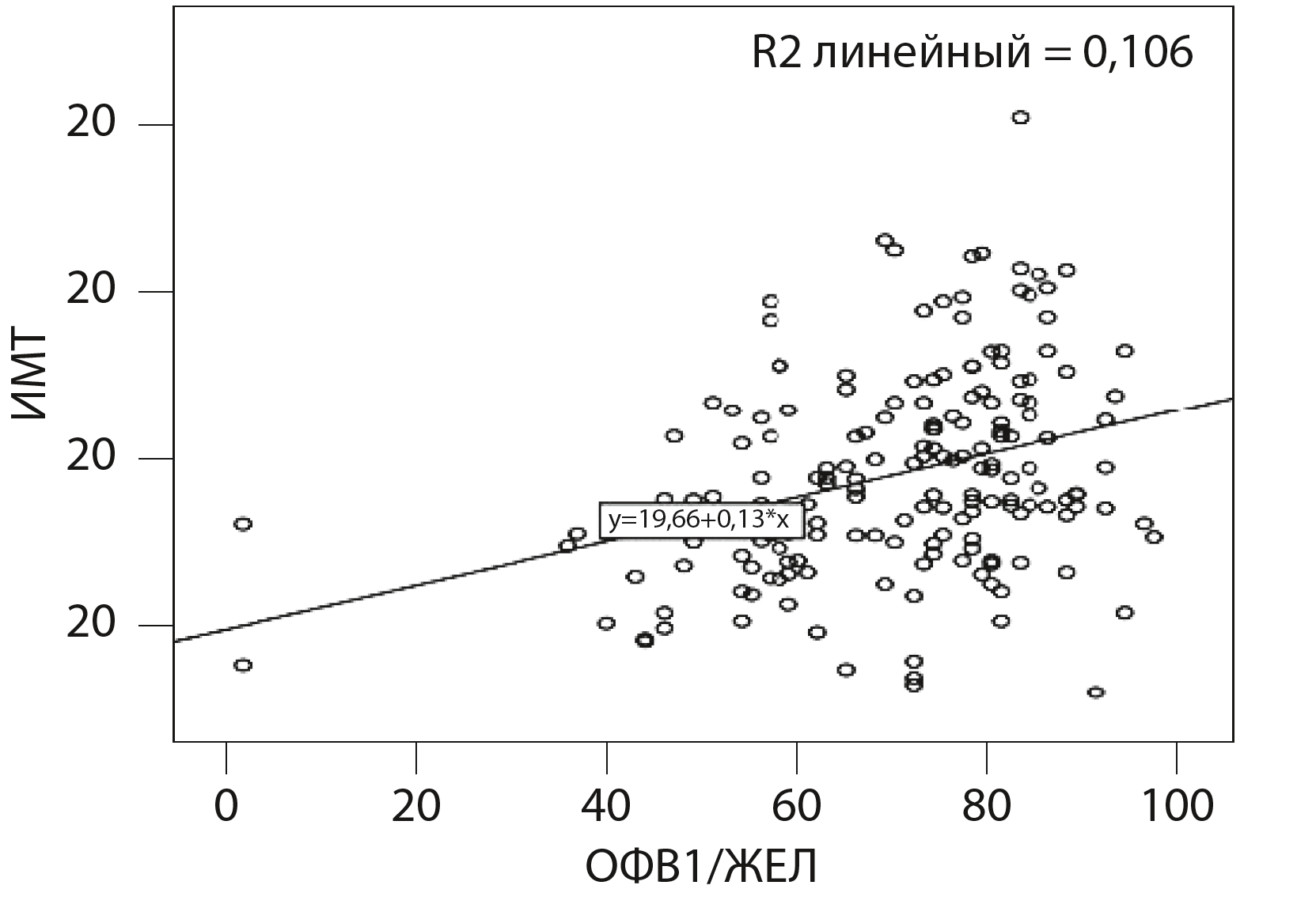 Asthma was under control in 20 (11.3%) patients out of 177 subjects, which 9 (45%) 10 (50%) and 1 (5%) were mildly, moderately and severely asthmatic, respectively. As established by Pearson’s correlation coefficient a positive and significant correlation is present between BMI and FEV1/FVC values (r=0.32 & P=0.0001) (figure 1). However no meaningful correlation was observed between FEV1 and BMI values (r=0.13 and P=0.06).
