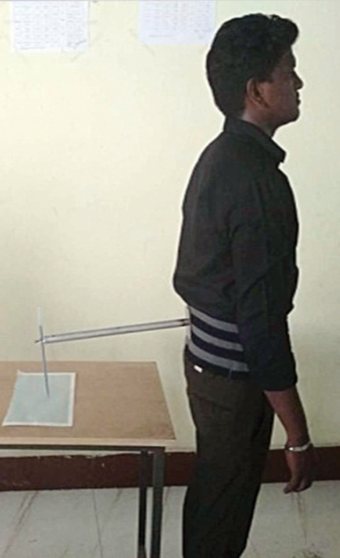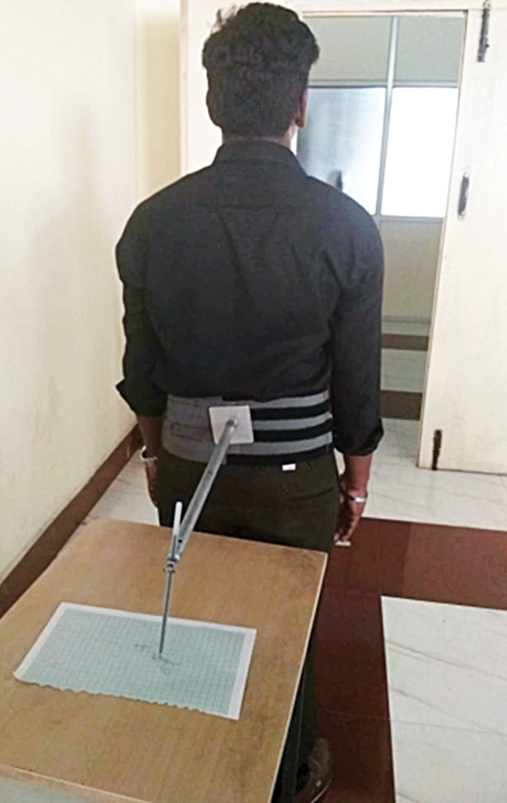 The sway meter was developed with a 40 cm pole attached to a belt and at the opposite end of the bar pen was appended to quantify the postural sway. The belt was fit at level of anterior superior iliac spine. The graph sheet was set behind the subject and relocation of graph sheet ought to be avoided amid the estimation. Sway meter was set behind the subject, where the impact of vision was likewise barred as illustrated in Fig.1 and Fig.2. Subject should remain on the sheet of paper with foot impressions; the separation between the feet was around 3 inches. The technique was explained to the subjects previously beginning every preliminary.