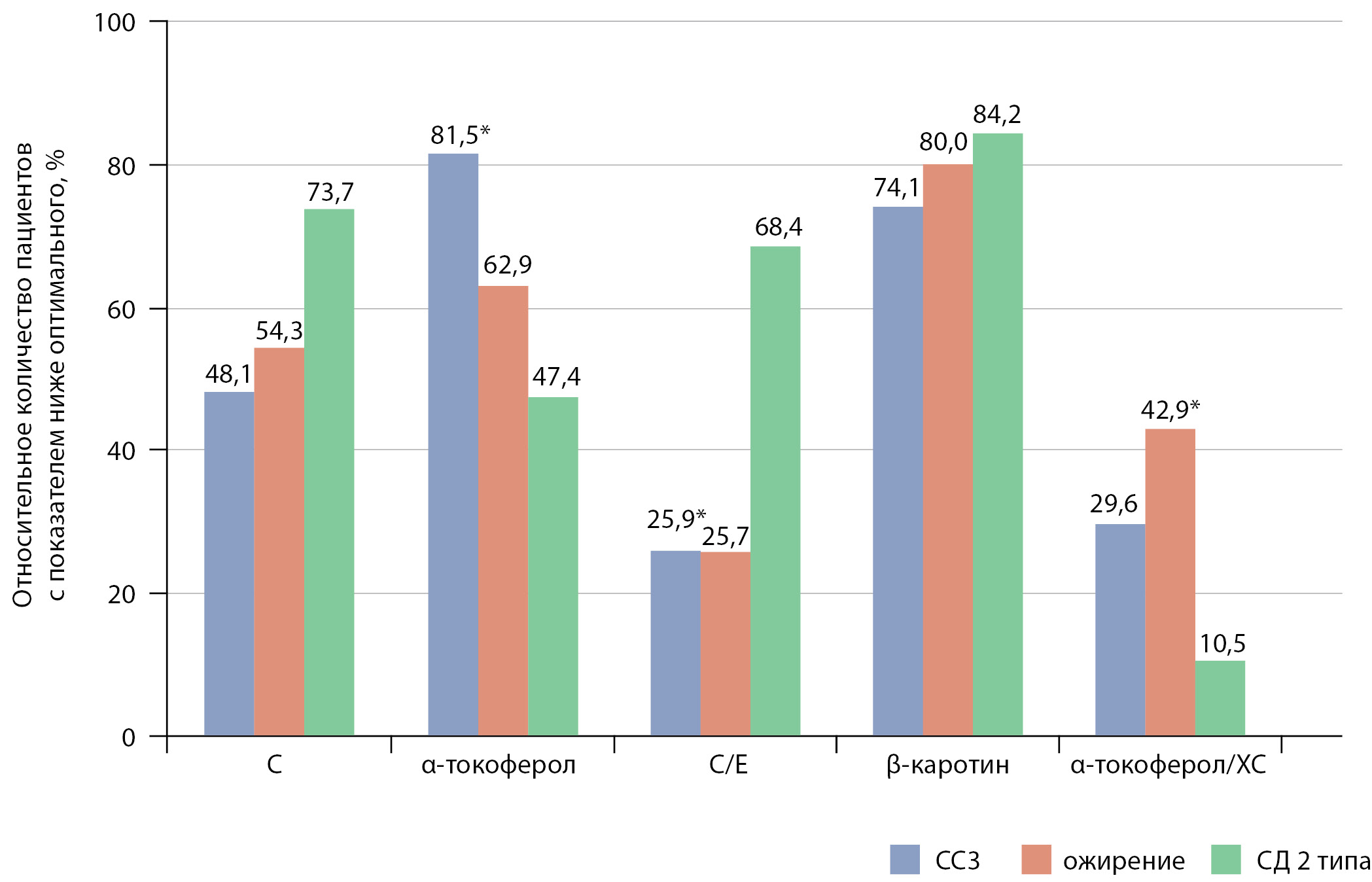 Результаты. Показатели витаминного статуса были определены у 35 пациентов с ожирением, 27 пациентов с избыточной массой тела или ожирением и сердечно-сосудистыми заболеваниями (ССЗ), 19 пациентов с ожирением и сахарным диабетом 2 типа (СД2). Концентрация аскорбиновой кислоты более чем у 50% пациентов не достигала оптимального уровня (50 мкмоль/л). По сравнению с пациентами других групп пациенты с СД2 были лучше обеспечены витамином Е, но хуже – другими витаминами. У них неоптимальное соотношение концентраций витамина С и Е выявлялось чаще по сравнению с пациентами других групп (р≤0,050). Среди них в 1,6–1,8 раза чаще выявлялась сочетанная неоптимальная обеспеченность витамином С и β-каротином (<0,4 мкмоль/л). Недостаток антиоксидантов у пациентов с СД2 по критериям соотношения витаминов С/Е (>1,5) и уровню β-каротина обнаруживался чаще в 3,3 раза, С/Е и витамина С – в 2,4 раза. Уровень γ-токоферола в сыворотке крови пациентов с СД2 имел тенденцию к повышению по сравнению с таковым у пациентов с ожирением (р=0,063) и ССЗ (р=0,081), концентрационное отношение γ-токоферол/холестерин (ХС) было выше в 1,5 раза (соответственно р=0,009 и р=0,076). Лишь у 2 пациентов с ожирением и 2 пациентов с ССЗ все показатели сыворотки крови соответствовали оптимальной обеспеченности всеми витаминами. По показателю α-токоферол/ХС (<5 мкмоль/ммоль) повышенный риск возникновения инфаркта миокарда имели от 10,5 до 42,9% обследованных пациентов. Выявлена прямая связь между уровнем глюкозы и содержанием в сыворотке крови α- и γ-токоферолов, а также индивидуальных токоферолов, соотнесенных с ХС, и обратная связь между гликемией и индивидуальными токоферолами, соотнесенными с триглицеридами, а также с β-каротином и величиной С/Е.
