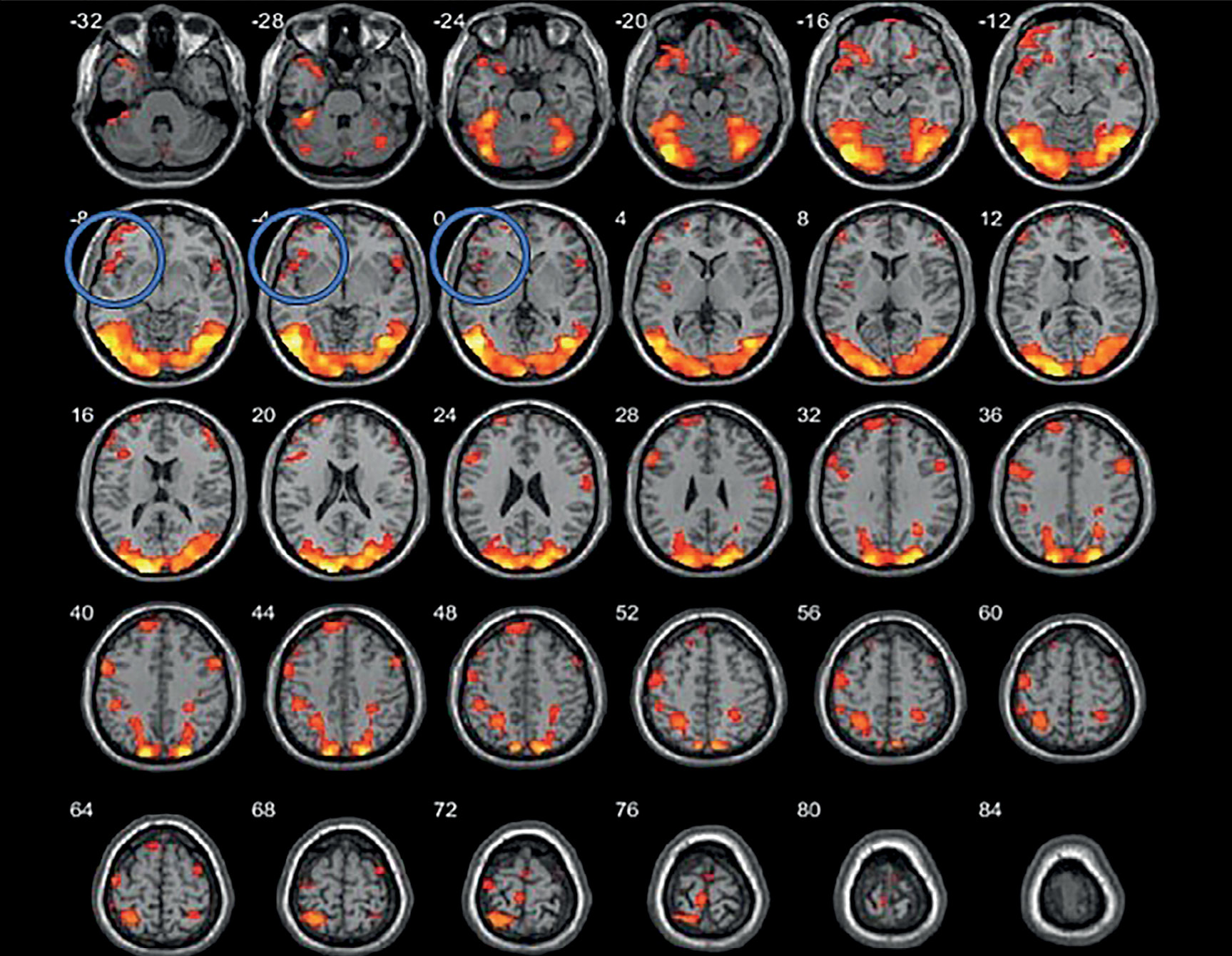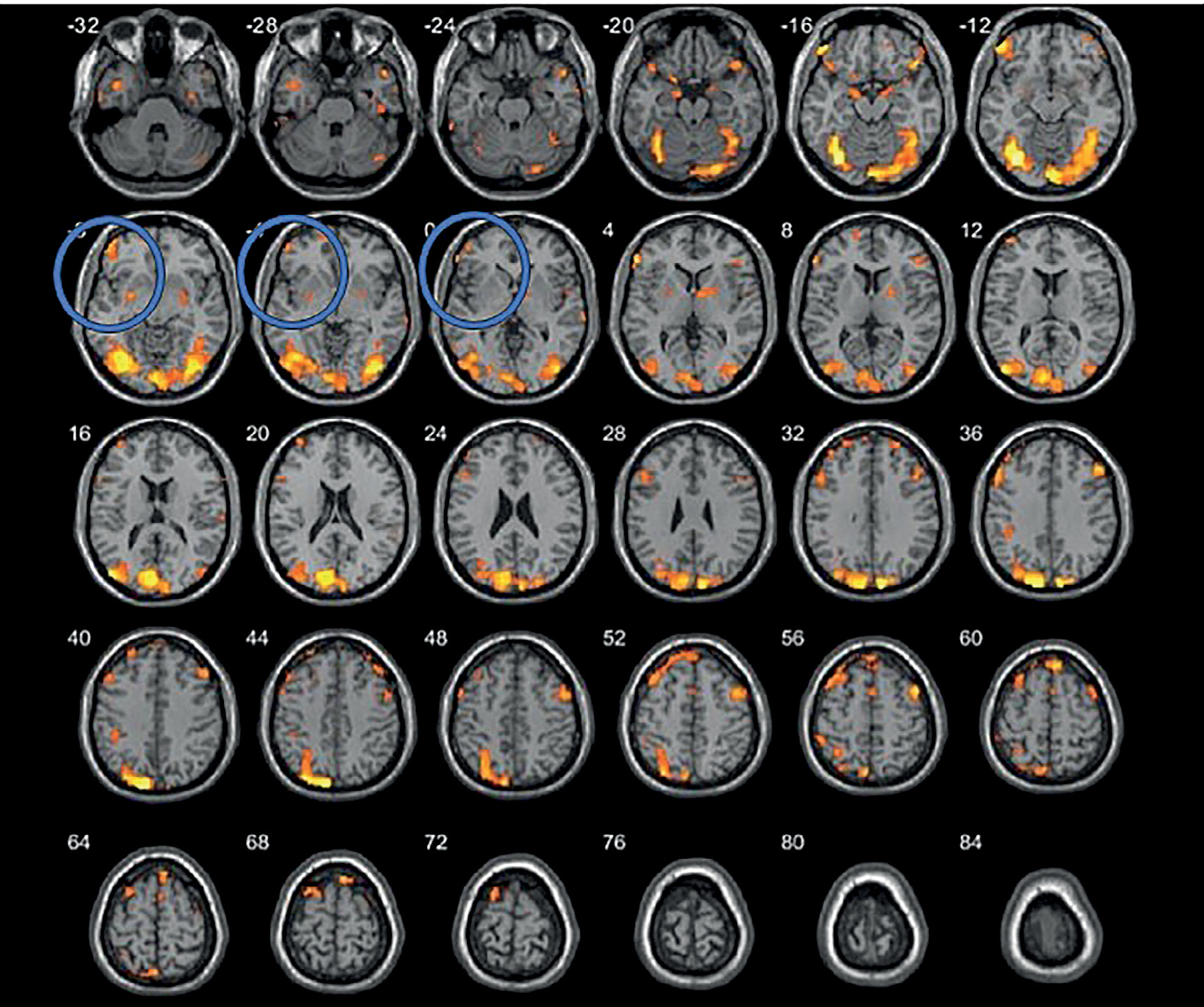 Рисунок 3. Данные функциональной МРТ (до лечения), синим кругом выделена область активации в зоне интереса (левая ДЛПФК) (пациентка Ш.)