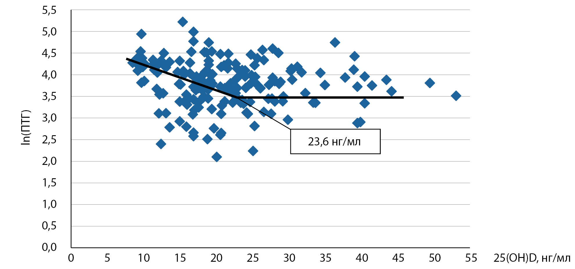 Результаты. Проведенный математический анализ зависимости 25(OH)D и ПТГ показал значение «точки отсечения» витамина D, равное 23,6 нг/мл.