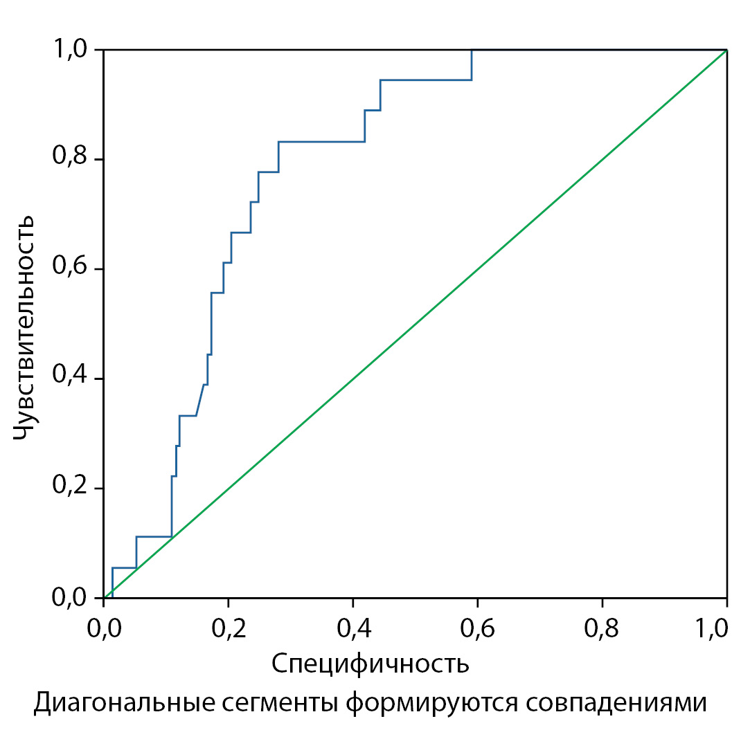 В нашем исследовании AUC составила 0,790. Для выбранной точки разделения чувствительность составила 81,3%, специфичность – 72,8%, что говорит о высокой чувствительности и специфичности данного показателя.