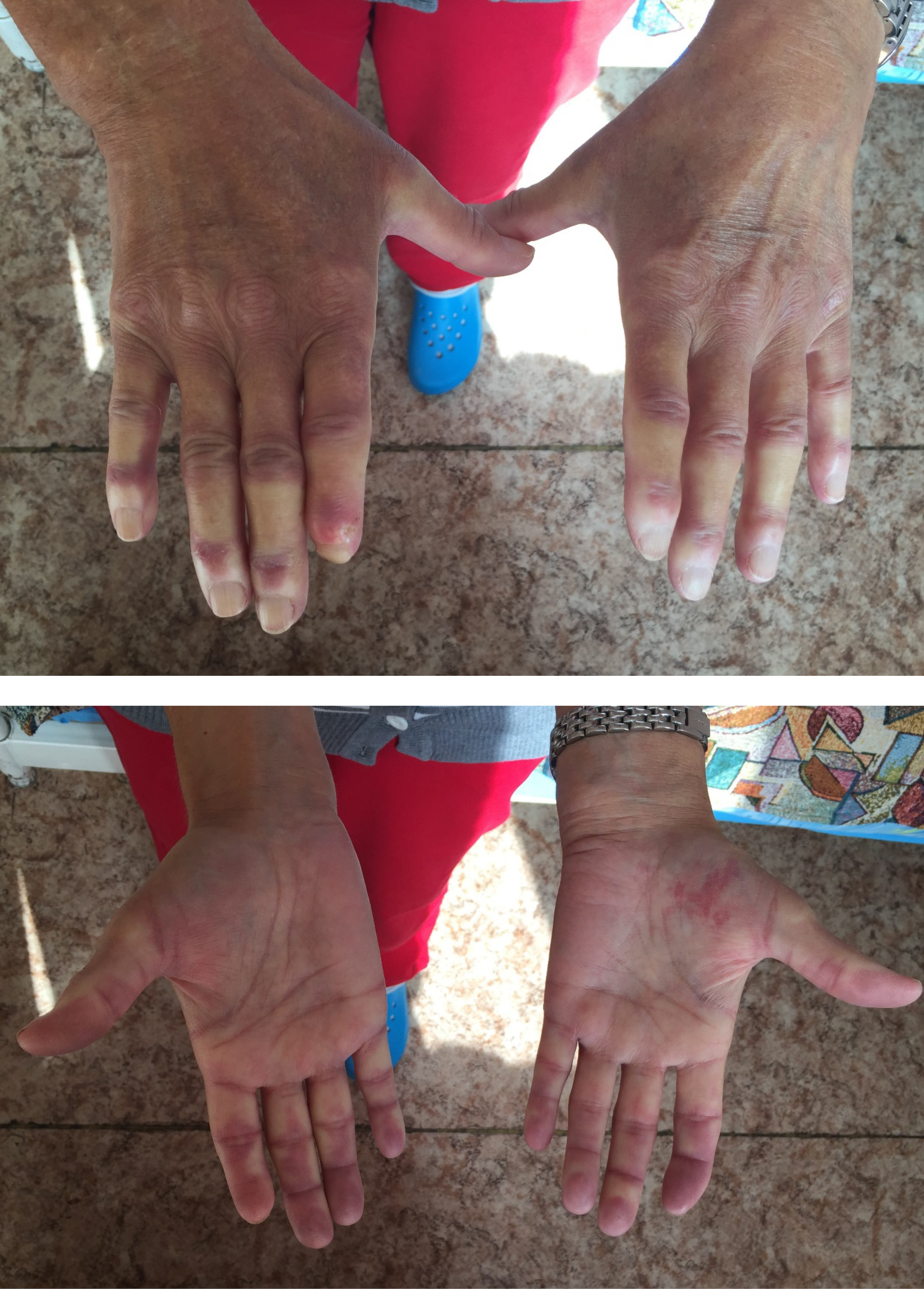 2. Рисунок 2. Синдром Рейно у пациентки с аутоиммунным полигландулярным синдромом 3d типа: первичный гипотиреоз, сахарный диабет 1 типа, лимитированная форма системной склеродермии, витилиго (наблюдение авторов). | |