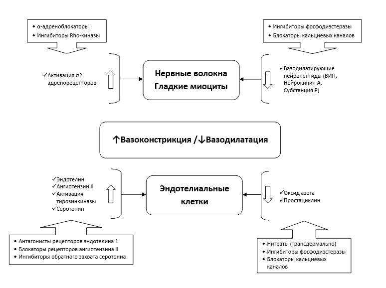 Рисунок 1. Патогенетические механизмы и терапевтические мишени при синдроме Рейно (адаптировано из [1])
