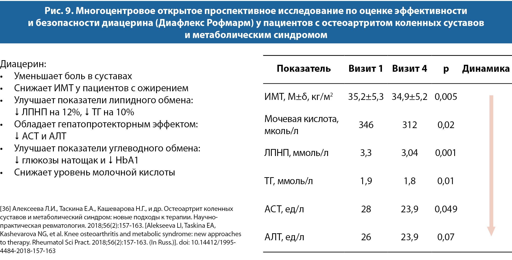 9. Fig. 9. A multicenter, open, prospective study evaluating the efficacy and safety of diacerin (Diaflex Rofmarm) in patients with knee osteoarthritis and metabolic syndrome | |