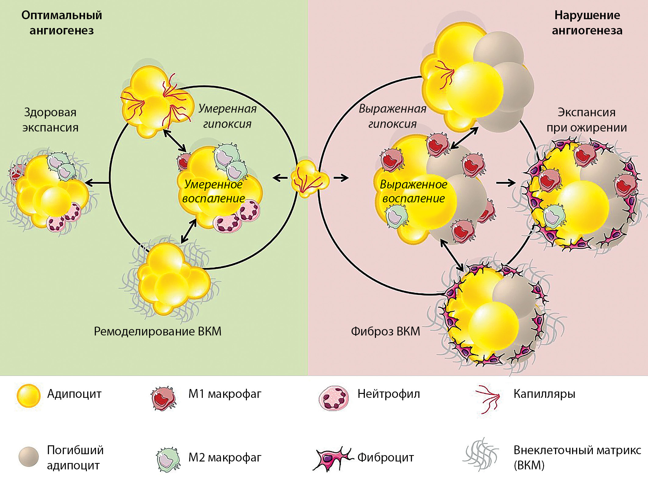 Помимо основной роли – депонирования запасов энергии в виде триглицеридов (ТГ) и мобилизации свободных жирных кислот – жировая ткань обеспечивает регуляцию иммунного гомеостаза. Белые адипоциты составляют до 90% объема жировой ткани и до 20–40% количества всех ее клеток. Адипоциты вырабатывают порядка 600 адипокинов – биологически активных субстанций, действующих на основе паракринных, аутокринных либо эндокринных эффектов и осуществляющих коммуникации с центральной нервной системой, сердцем, мышечной тканью, сосудами, поджелудочной железой, другими органами и тканями. Адипокины включают классические цитокины, хемокины, белки альтернативной системы комплемента; белки, регулирующие сосудистый гомеостаз, ангиогенез, артериальное давление, метаболизм липидов, углеводов. Стромальный сосудистый комплекс представлен преадипоцитами, фибробластами, клетками эндотелия и гладкой мускулатуры, а также клетками иммунной системы – макрофагами, лимфоцитами, дендритными клетки, эозинофилами, мастоцитами. Стромальные клетки участвуют в поддержании гомеостаза жировой ткани, регулируя образование капилляров, формирование внеклеточного комплекса, продукцию цитокинов и гормонов [8, 9]. Макрофаги – наиболее многочисленная популяция иммунных клеток жировой ткани. В стабильном состоянии на их долю приходится 5–10% всех лейкоцитов (макрофаги-резиденты), при ожирении их количество возрастает до 50% вследствие рекрутирования из сосудистого русла (макрофаги-рекруты). В зависимости от экспрессии поверхностных маркеров и профиля цитокинов макрофаги подразделяют на 2 типа. Альтернативно активируемые М2-макрофаги характеризуются экспрессией участвующих в фагоцитозе рецепторов маннозы (CD206) и галактозы-C-лектина 1 типа (MGL1), а также антивоспалительных цитокинов, таких как интерлейкин-10 (ИЛ-10) и трансформирующий фактор роста-β (ТФР-β). Классически активируемые М1-макрофаги экспрессируют CD11c и вырабатывают провоспалительные цитокины ИЛ-6, α-ФНО и др. При положительном энергобалансе здоровая экспансия жировой ткани развивается преимущественно путем рекрутирования и дифференциации новых клеток-предшественников адипоцитов, что способствует формированию гиперпластического, инсулин-чувствительного фенотипа ожирения [10, 11]. Сосудистое русло – источник мезенхимальных стволовых клеток, которые рекрутируются жировой тканью для преобразования их в преадипоциты. По мере потребности организма преадипоциты включаются в программу адипогенеза. Учитывая доминирующую роль в процессе запасания и обеспечения организма энергией, жировая ткань нуждается в гарантированной доставке должного количества кислорода и нутриентов. Соответственно, реализация функций жировой ткани напрямую зависит от состояния ее сосудов. Внеклеточный матрикс (ВКМ) присутствует во всех тканях организма, обеспечивая сохранность их архитектоники, морфогенез и дифференциацию. ВКМ, преимущественно представленный коллагеном, фибронектином и протеогликанами (бигликан, декорин), постоянно адаптируется к динамическим изменениям объема адипоцитов. ВКМ служит резервуаром для секретируемых жировой тканью ростовых факторов, цитокинов и протеаз, доступность которых играет важнейшую роль для структурной интеграции адипоцитов и процессов адипогенеза [12, 13]. Под влиянием противовос