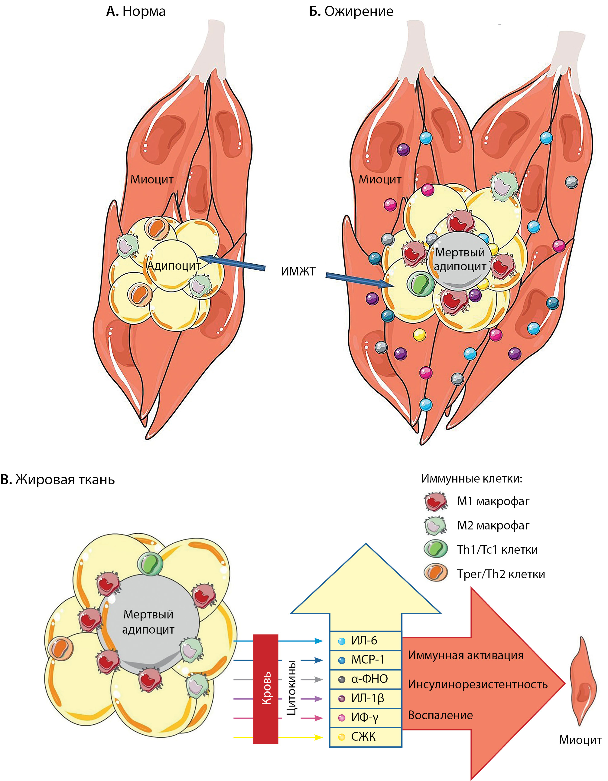 Сокращения: ИМЖТ – интермиоцитарная жировая ткань; Th1 – Т-хелперы 1 типа; Tc1 – цитотоксические Т-клетки 1 типа; Трег – Т-регуляторные клетки, Th2 – Т-хелперы 2 типа; ИЛ-6 – интерлейкин-6; МСP-1 – моноцитарный хемоаттрактантный протеин-1; α-ФНО – α-фактор некроза опухоли; СЖК – свободные жирные кислоты; ИЛ-1β – интерлейкин -1β; ИФ-γ – интерферон-γ.