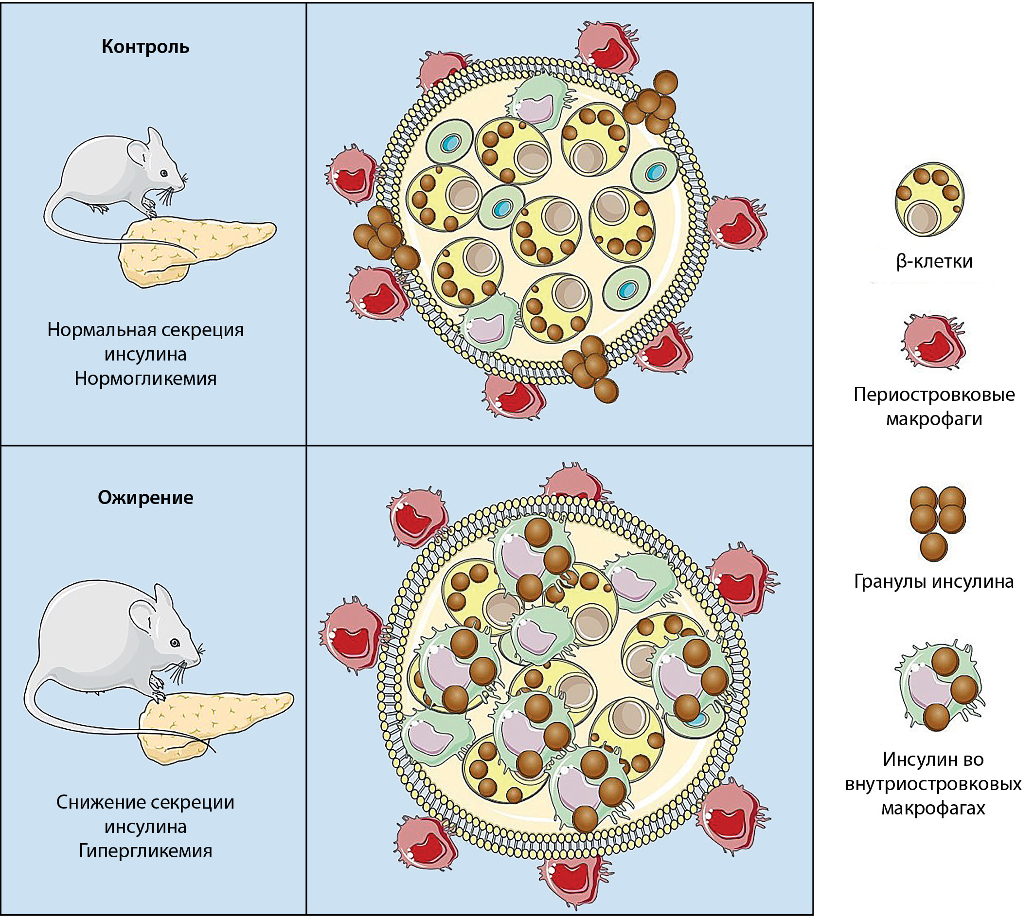 Рис. 3. Роль резидентных внутриостровковых макрофагов в гомеостазе глюкозы. Ожирение у мышей ассоциировано с экспансией внутриостровковых CD11c+ макрофагов, которые захватывают везикулы инсулина и нарушают его секрецию поджелудочной железой. Периостровковые и внутриостровковые макрофаги контролируют функцию β-клеток и гомеостаз глюкозы (адаптировано из работы O. Spadaro, V.D. Dixit, 2019 [36]).