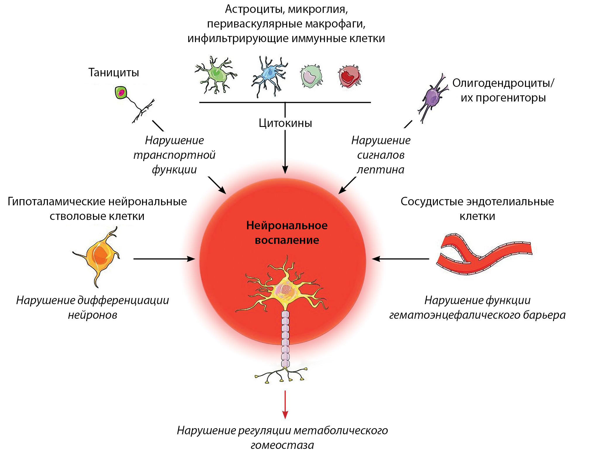 Рис. 4. Вклад клеток центральной нервной системы в патогенез гипоталамического воспаления (адаптировано из работы A. Jais, J.B. Brüning, 2017 [49]).