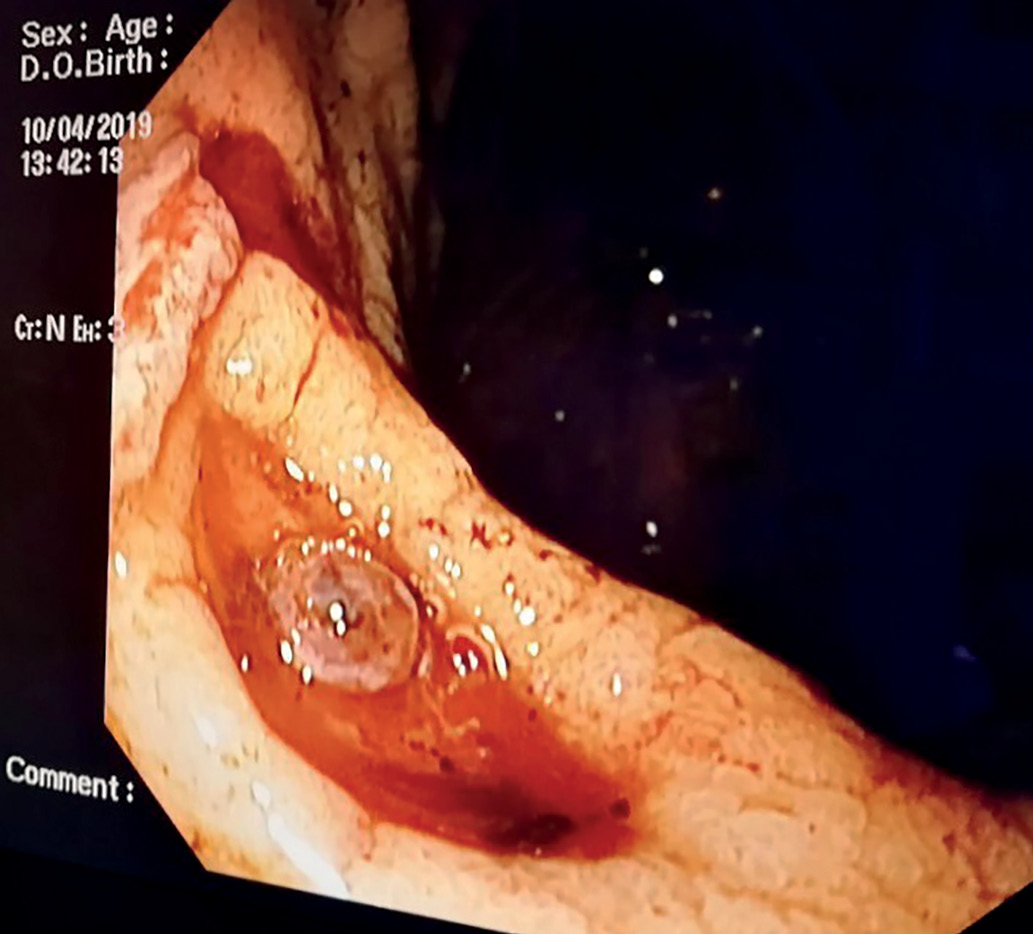 2. Figure 2. Intraoperative endoscopic picture: an ulcer of the angle of the stomach, in the bottom of which there is a thrombosed vessel
