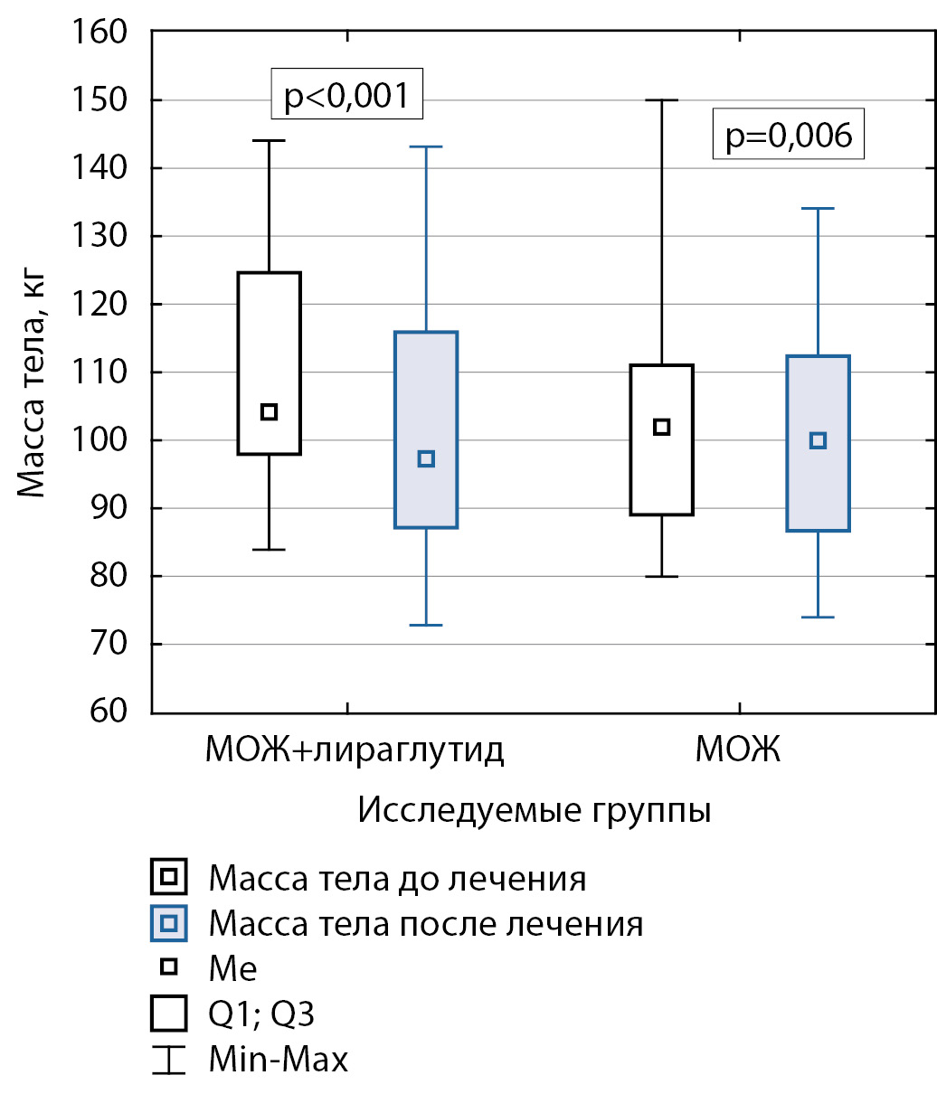 Пациенты с экзогенно-конституциональным ожирением были разделены на 2 группы: одна из групп (контрольная) после обследования получила стандартные рекомендации по коррекции рациона питания и физической активности (т.е. по МОЖ), другой группе в дополнение к указанным рекомендациям был назначен лираглутид (МОЖ+лираглутид) [1, 10]. В зависимости от терапевтического эффекта группа МОЖ+лираглутид была разделена на две подгруппы: достигших и не достигших клинически значимого снижения массы тела спустя 16 недель лечения.