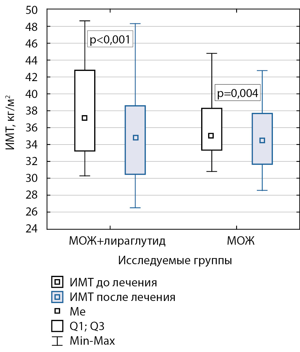 2. Рисунок 2. Изменение ИМТ в исследуемых группах (модификация образа жизни + лираглутид, n=22 и МОЖ, n=20), тест Вилкоксона | |