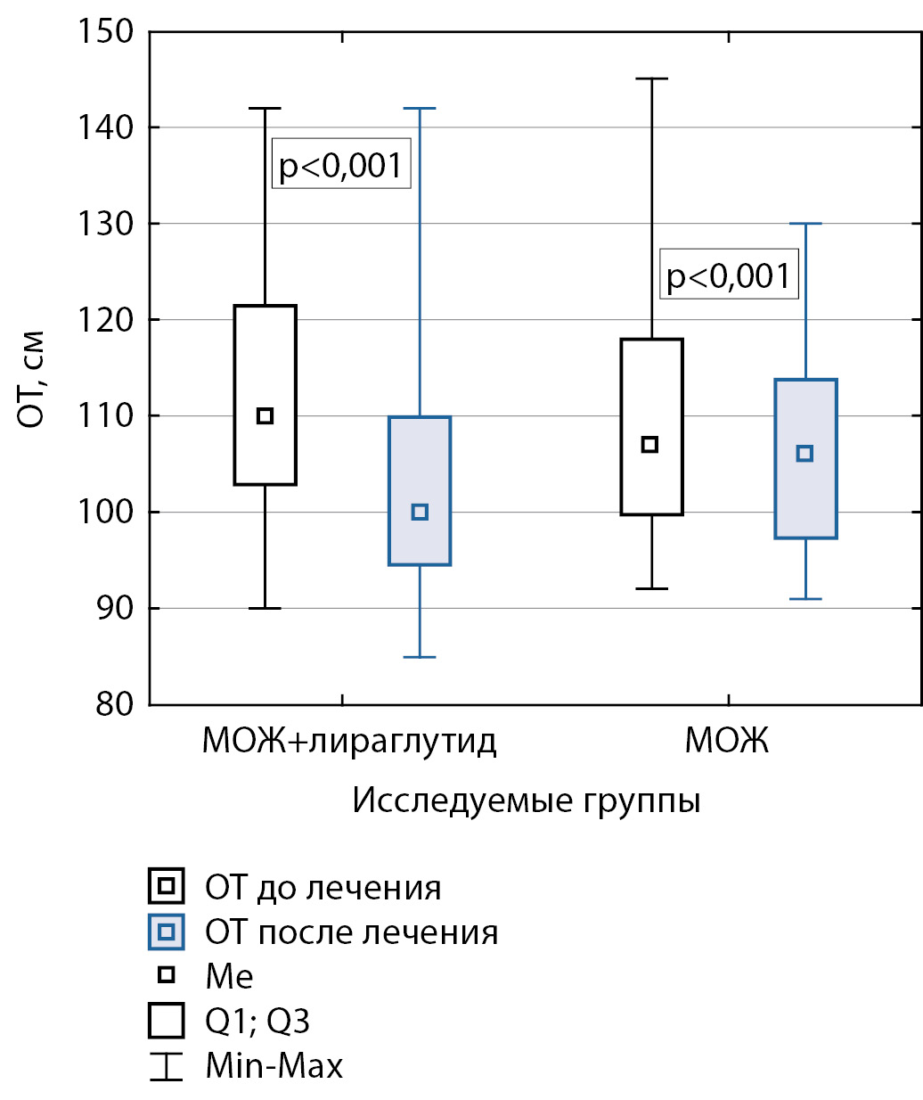 Рисунок 3. Изменение окружности талии в исследуемых группах (модификация образа жизни + лираглутид, n=22 и МОЖ, n=20), тест Вилкоксона