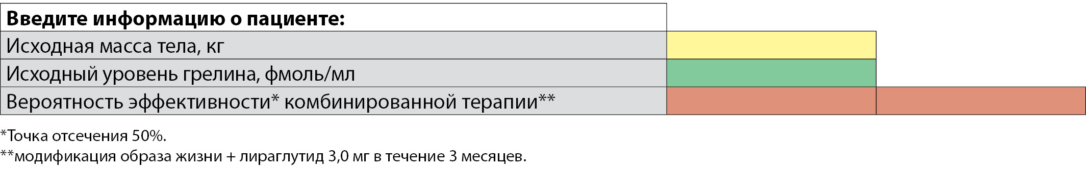С целью прогнозирования раннего ответа на лечение (МОЖ+лираглутид), нами была создана математическая модель, реализованная в виде онлайн-калькулятора и включающая исходные массу тела и уровень грелина плазмы пациента. Указанная модель имеет статистически значимые чувствительность – 86% и прогностическую ценность положительного результата – 80% и может быть рекомендована для применения в практике врача как удобный инструмент для расчета вероятности эффективности комплексной терапии экзогенно-конституционального ожирения с использованием агониста рецепторов ГПП-1 лираглутида.