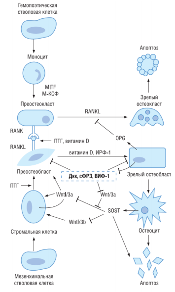 Все механизмы в конечном счете влияют на цикл костного ремоделирования, либо уменьшая процесс образования (остеобластогенез), либо увеличивая процесс разрушения костной ткани (остеокластогенез).