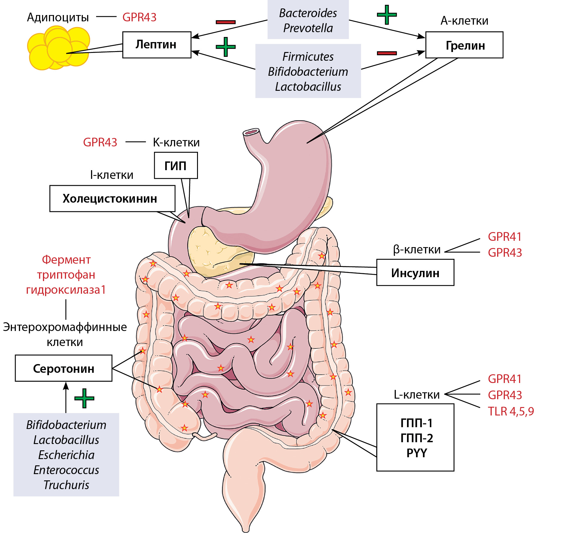 The gut microbiota affects the processes of food digestion, intestinal peristalsis, controls the work of the intestinal epithelium, has protective properties against pathogenic microorganisms, activating local immunity and stimulating the secretion of mucus by intestinal cells. Besides the gut microbiota participates in the metabolism of proteins, fats and carbohydrates, mediates the processes of gluconeogenesis, glycogenolysis, lipogenesis and lipolysis, and affects on feelings of hunger and satiety. All these processes occur because the gut microbiota produces active metabolites throughout their life activity. Gut microbiota and active metabolites of the gut microbiota activate the synthesis of hormones. The gut microbiota affects the synthesis of hormones such as glucagon-like peptide-1, glucagon-like peptide-2, YY-peptide, glucose-dependent insu-linotropic peptide, ghrelin, leptin, cholecystokinin, serotonin, and insulin. Disturbance of the secretion of these hormones is one of the links in the pathogenesis of endocrine diseases such as diabetes and obesity. Thus, the gut microbiota is an endocrine organ. Changes in the composition and functions of the gut microbiota lead to metabolic disorders.