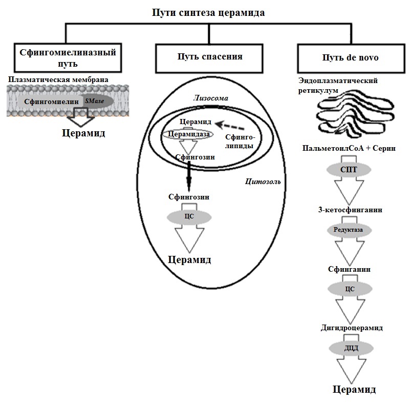 Хорошо охарактеризованы 3 пути синтеза церамидов (рис. 1): сфингомиелиназный путь, путь рециклинга/«спасения» и путь de novo [4][5].