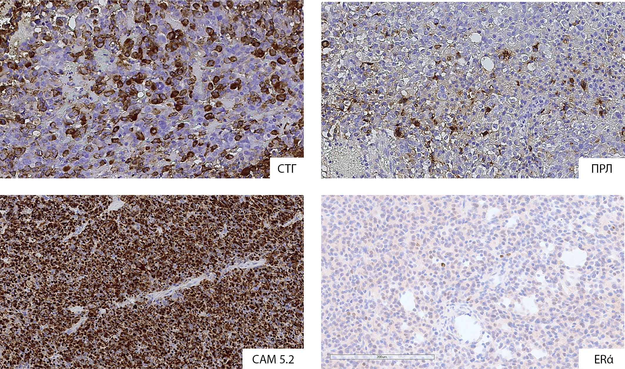 Результаты иммуногистохимического исследования соответствовали наличию маммосоматотропиномы (положительная иммуноэкспрессия к СТГ, ПРЛ и PIT-1, большинства клеток — к низкомолекулярному цитокератину, 1–2% клеток — к эстрогеновым рецепторам альфа (рис. 4)).