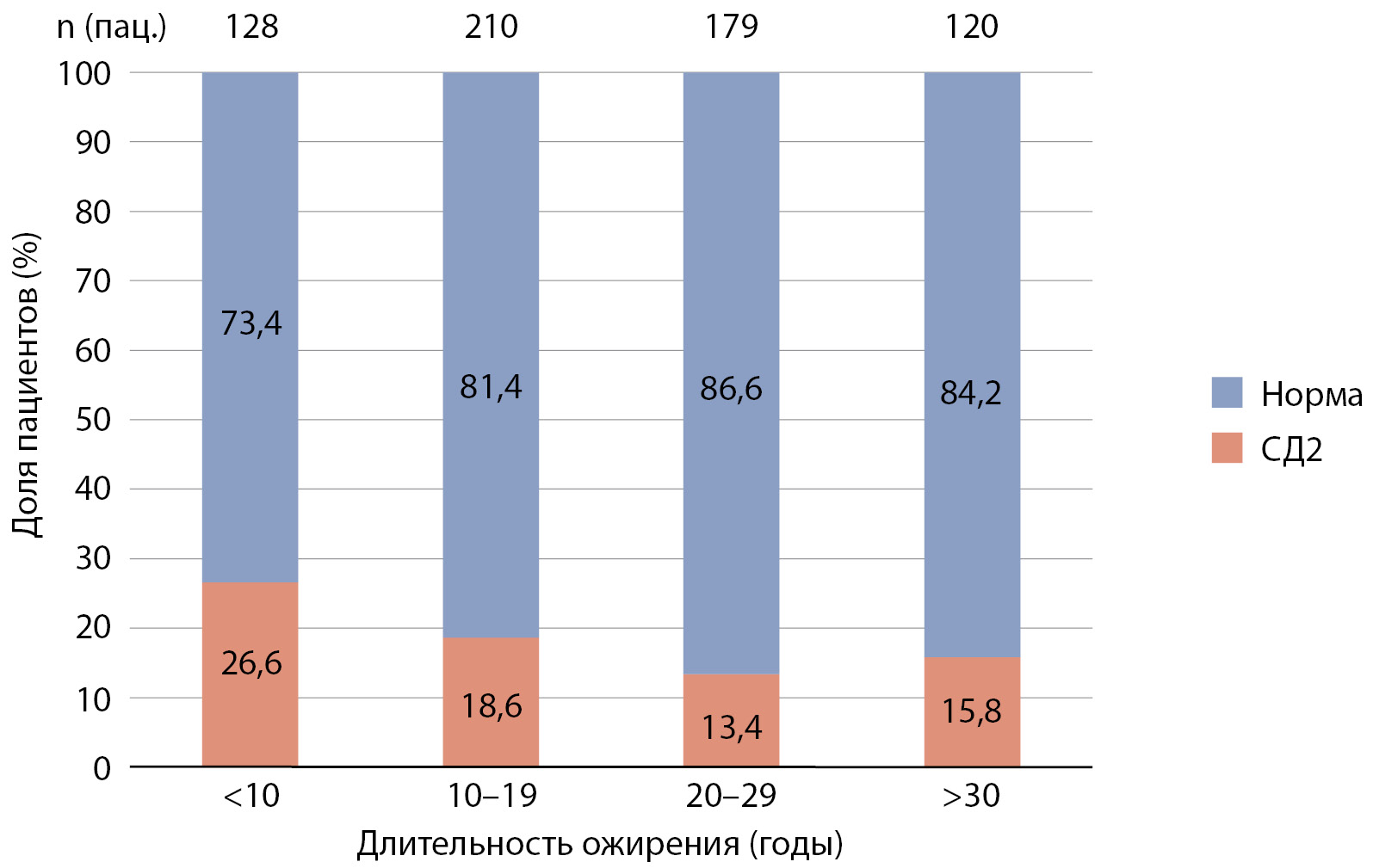 Рисунок 1. Доли пациентов с сахарным диабетом 2 типа и без нарушений углеводного обмена («норма») при различной длительности избыточного веса или ожирения (над столбцами указано абсолютное число пациентов в каждой группе).