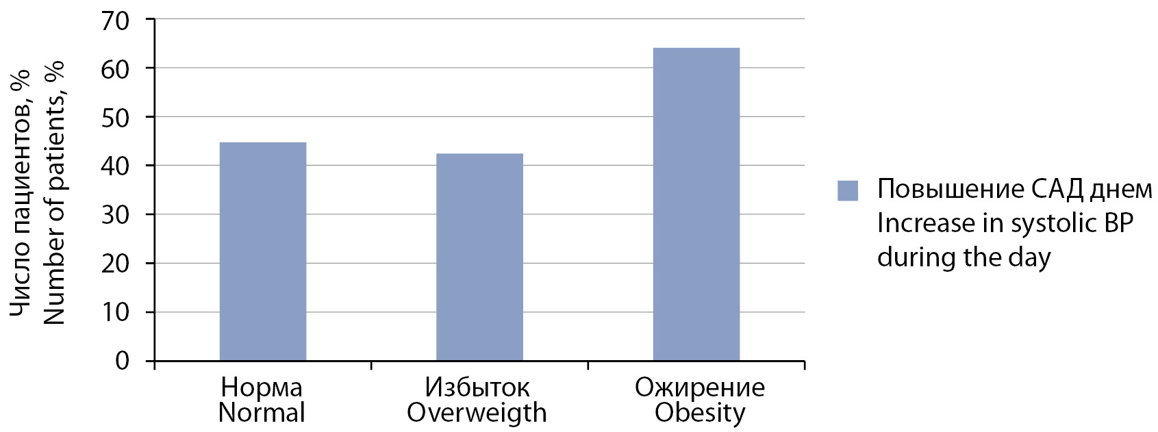 2. Рисунок 2. Частота встречаемости патологических значений среднего систолического артериального давления днем у пациентов с различной массой тела.