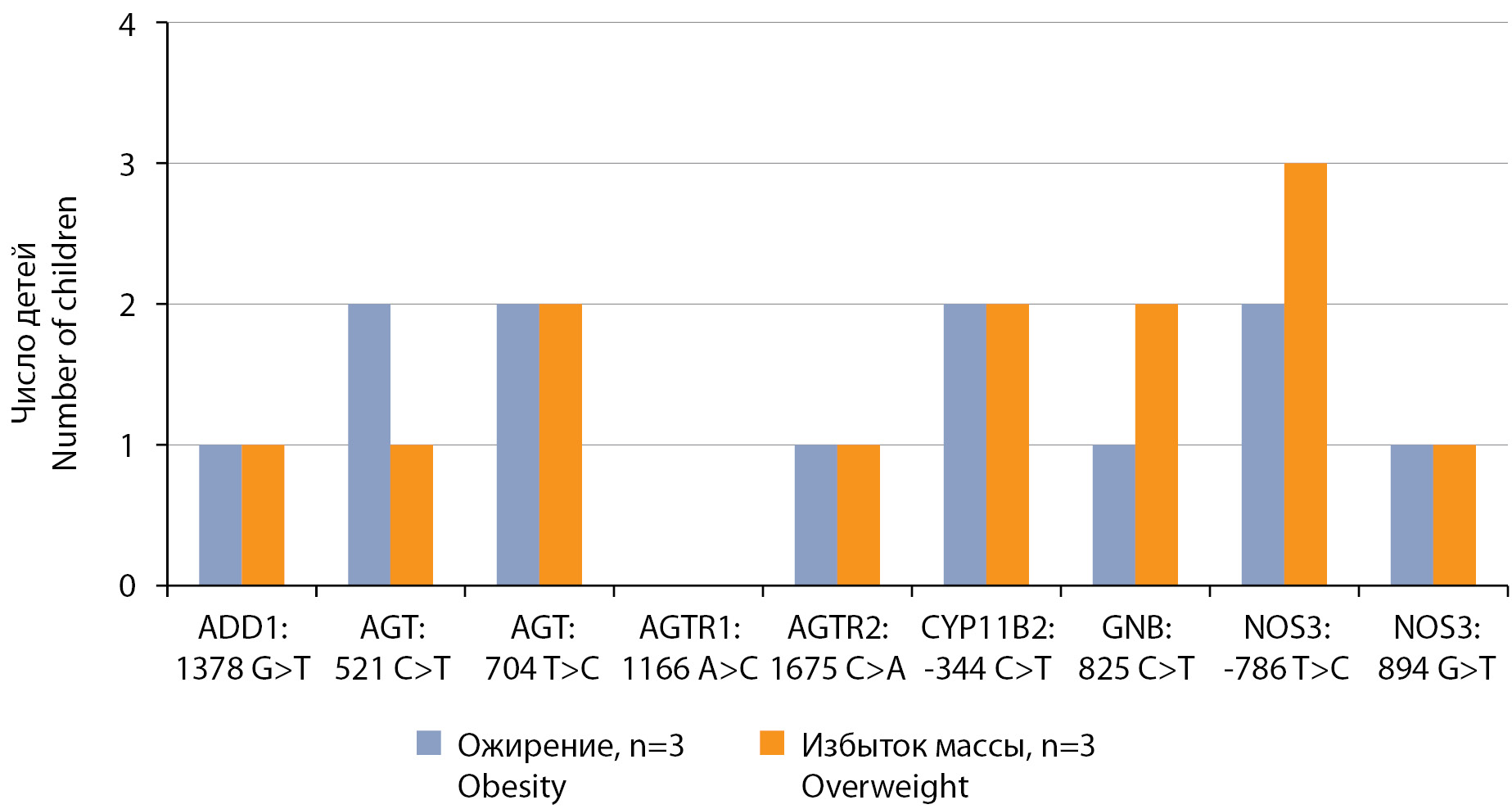 У всех пациентов выявлялись патологические аллели генов, ассоциированных с АГ. Двое детей с избытком массы тела имели изменения генов ангиотензиногена, что может приводить к повышению уровня ангиотензиногена в крови, гена альдостерон-синтазы и эндотелиальной синтазы азота. Реже у детей с избытком массы тела выявлялись изменения генов белка альфа-аддуцина, участвующего в транспорте ионов натрия в клетках почечных канальцев, гена ангиотензинового рецептора 2, гена, кодирующего активность G-белка.
