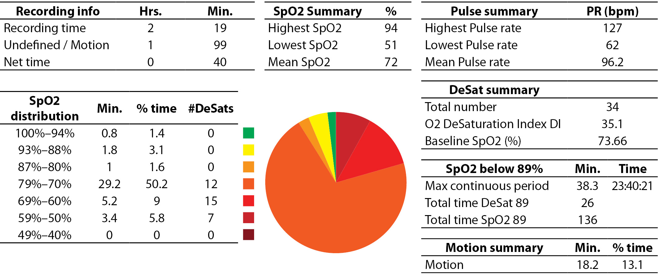 По результатам респираторного мониторинга было зарегистрировано 129,4 эпизода апноэ обструктивного генеза и 14,6 эпизода апноэ центрального генеза. Индекс апноэ/гипопноэ составил 144 события в час. Максимальная продолжительность апноэ — 49 с; средняя длительность апноэ — 14 с. Нарушения дыхания сопровождались эпизодами тяжелых десатураций с минимальным значением 43%. Средние показатели SpO2 в течение ночи составили 67% (рис. 1).