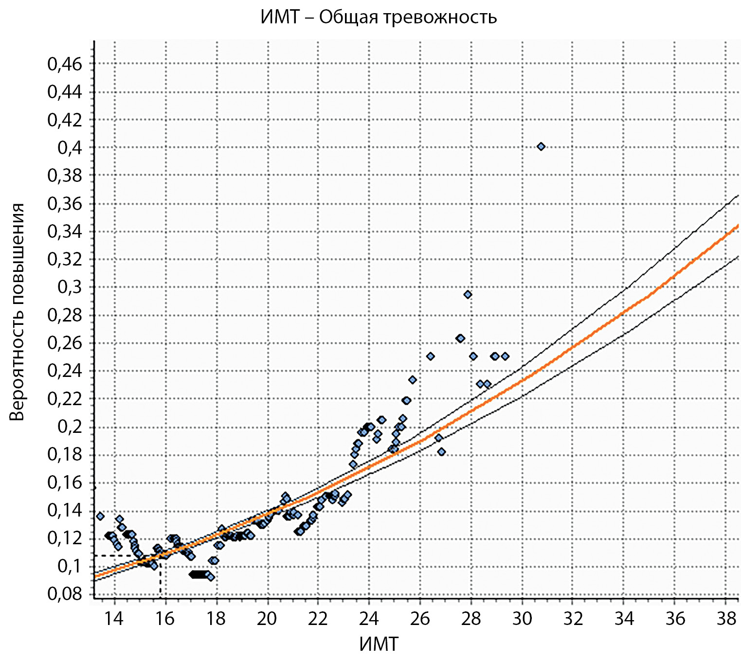 4. Figure 4. Plot of the logistic regression model of the relationship "BMI — General anxiety" (b0=-3.12; b1=0.06; R2=0.67; p<0.0001). | |