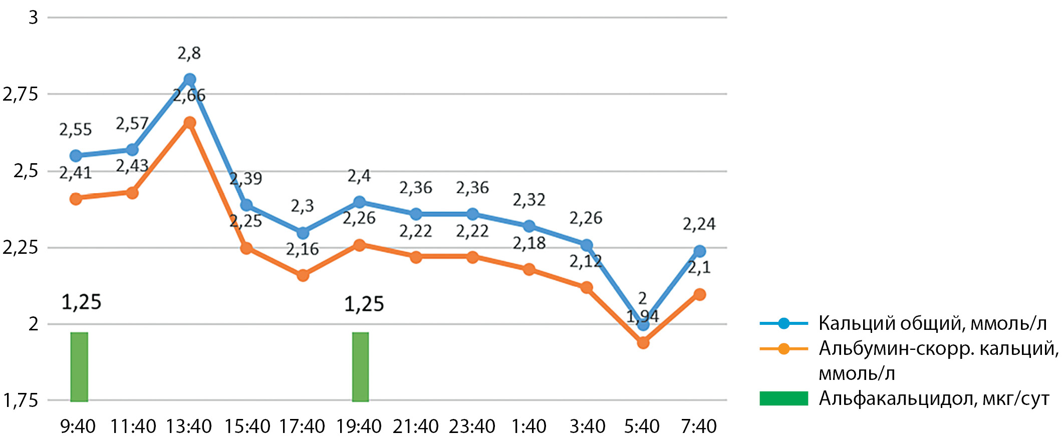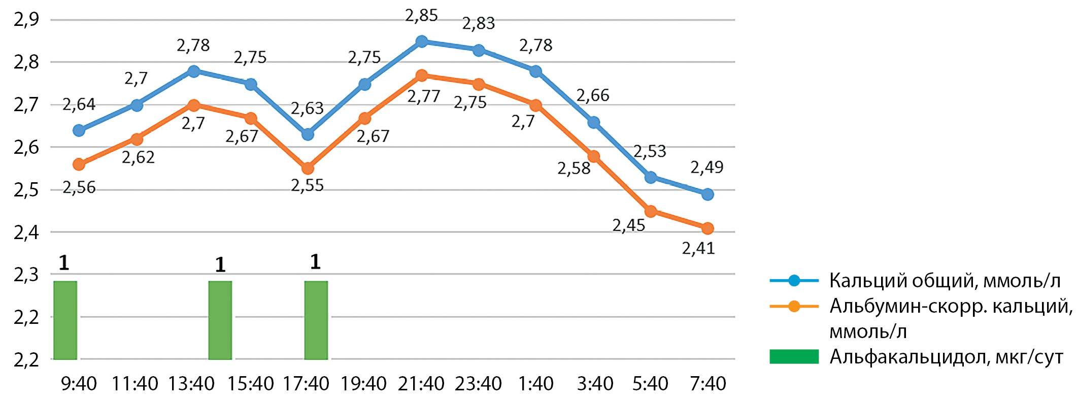 В связи с наличием специфических жалоб, а также для решения вопроса о коррекции терапии пациентке была проведена оценка суточного профиля кальциемии (определение общего и альбумин-скорректированного кальция каждые 2 ч в течение суток). По результатам анализов впервые были зафиксированы эпизоды гиперкальциемии до 2,8 ммоль/л по кальцию общему (2,66 ммоль/л по альбумин-скорректированному кальцию) в дневные часы и гипокальциемии до 2,0 ммоль/л по кальцию общему (1,94 ммоль/л по альбумин-скорректированному кальцию) в ранние утренние часы (рис. 1).