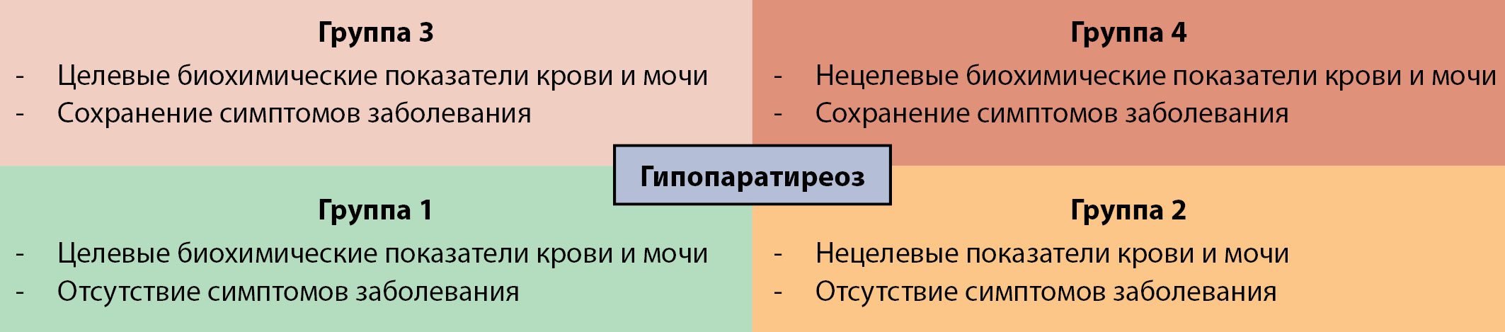 Определение принадлежности пациента с гипопаратиреозом к той или иной группе в зависимости от степени контроля над заболеванием может помочь клиницисту в выборе тактики ведения и лечения, а также кратности наблюдения. Нашими коллегами были предложены следующие показатели, оказывающие важное влияние на компенсацию заболевания, которые легли в основу формирования матрицы представления о пациенте с хроническим гипопаратиреозом (рис. 3) [4].