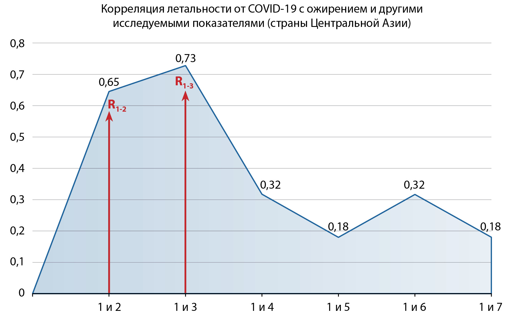 При сравнении корреляционных связей летальности с лишним весом, ожирением, возрастом, предполагаемой продолжительностью жизни и недостаточной физической активностью прослеживается аналогичная зависимость, как и в большинстве развитых европейских стран и США. Наивысшая корреляция летальности (R) отмечается с ожирением (R1–3) и избыточной массой тела (R1–2). Полученные расчеты представлены в виде диаграммы на рис. 3.