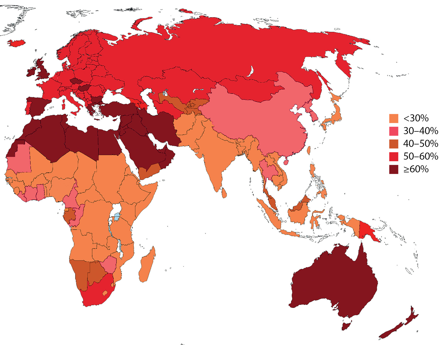 Рисунок 2. Распространенность избыточной массы тела (>25 кг/м2) у взрослых. Доля жителей с избыточной массой тела, %. *