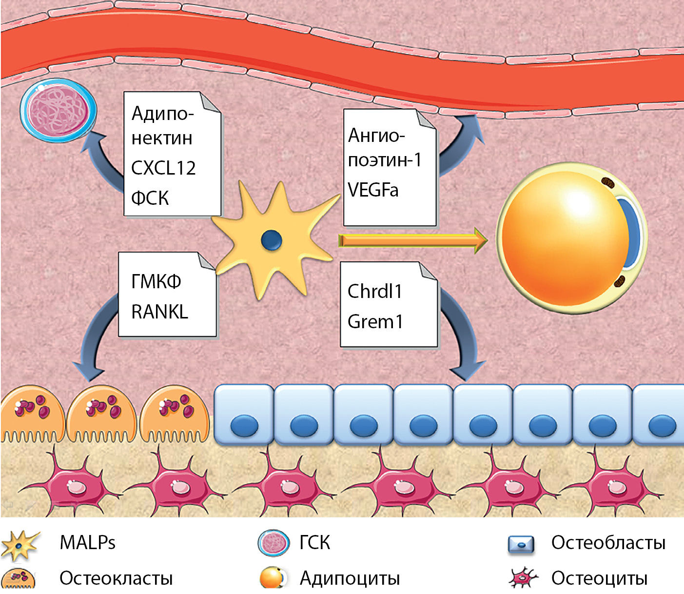 Сокращения: MALPs — marrow adipogenic lineage precursors; ГСК — гемопоэтические стволовые клетки; ФСК — фактор стволовых клеток; ГМКФ — гранулоцитарно-макрофагальный колониестимулирующий фактор; RANKL — receptor activator of nuclear factor kappa-B ligand, Grem1 — Gremlin 1, Chrdl1 — Chordin Like 1; СХСL12 — хемокин (С-Х-С мотив) лиганда 12.