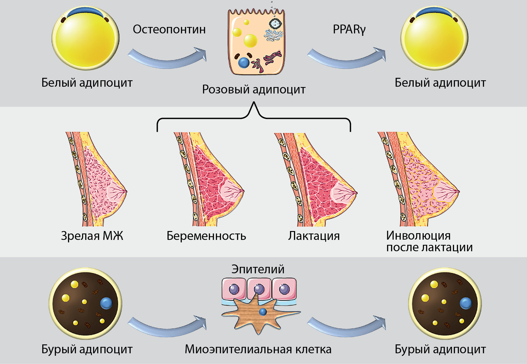 В отличие от других органов, молочные железы, закладывающиеся на 6 неделе внутриутробного периода из элементов эктодермиса, завершают свое развитие лишь к пубертату и достигают зрелого функционального состояния во время беременности. Адипоциты МЖ берут начало от периваскулярных мезенхимальных стволовых клеток. Альвеолярный эпителий развивается из взрослых маммарных стволовых клеток (МаСК) [87]. Исследования на трансгенных мышах показали, что в дополнение к МаСК адипоциты МЖ тоже участвуют в формировании альвеолярных клеток путем трансдифференциации. Во время беременности уменьшение количества белых унилокулярных адипоцитов сопровождается появлением мультилокулярных клеток, сходных по морфологии с эпителием (прямая адипоэпителиальная трансдифференциация). Розовая окраска схожих с эпителием адипоцитов отражает особенности цвета молочной железы, насыщенной в этот период кровеносными сосудами. Помимо липидных капель, розовые адипоциты содержат наполненные молоком вакуоли, крупные митохондрии, пероксисомы, гранулярный эндоплазматический ретикулум, цитоплазматические проекции, а также микроворсинки на апикальной поверхности. Розовые адипоциты участвуют в формировании альвеолярного аппарата молочной железы, синтезируют и секретируют компоненты грудного молока, вырабатывают адипокины. Таким образом, гибкая трансформация адипоцитов в эпителиальные клетки необходима для надежного энергетического обеспечения потомства. С прекращением лактации розовые адипоциты приобретают исходный фенотип белых жировых клеток (реверсивная адипоэпителиальная трансдифференциация) [91][92]. Как отмечает S. Cinti (2018), 70% секретирующих молоко эпителиальных клеток образуются путем конверсии адипоцитов, остальные берут начало от МаСК [91]. В работе Q. Wang и соавт. (2018) было определено, что во время лактации адипоциты МЖ дедифференцируются в преадипобласты с последующим редифференцированием в зрелые клетки в период инволюции. В данной работе авторы не обнаружили конверсию адипоцитов в альвеолярные клетки, что, возможно, обусловлено применением другой методики отслеживания клеточных поколений. Тем не менее, в дальнейших исследованиях была продемонстрирована трансдифференциация классических мезенхимальных преадипоцитов, экспрессирующих PDGFRα, в эпителиальные клетки протоков [94]. Кроме того, показана возможность прямой конверсии лобулоальвеолярных эпителиальных клеток в бурые адипоциты [95]. В свою очередь, бурые и бежевые адипоциты МЖ способны трансформироваться в миоэпителиальные клетки [96]. Установлено, что, несмотря на коммитированное состояние, зрелые адипоциты способны сохранять высокий уровень экспрессии генов репрограммирования [92]. Молекулярные механизмы, индуцирующие и контролирующие подобные прямые и обратные клеточные конверсии, в настоящее время не определены. По предварительным данным, в эти кардинальные преобразования генной экспрессии клеток вовлечены гормоны беременности (пролактин, прогестерон, эстрогены), а также паракринные факторы, вырабатываемые железой. Предположительно, весомую роль в процессе конверсии белых адипоцитов в розовые играет остеопонтин (или secreted phosphoprotein 1, Spp1), участвующий в лобуло-альвеолярном развитии и являющийся маркером прог