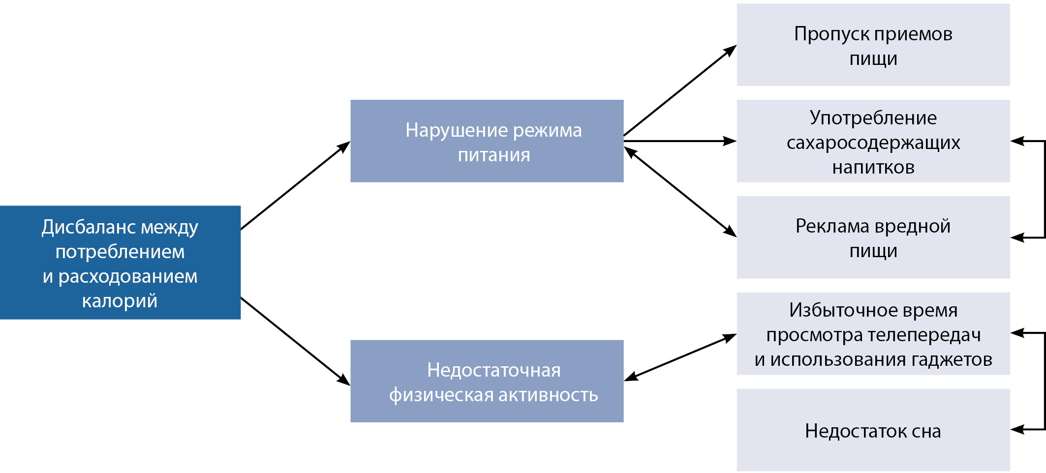 В современных экономических условиях одним из основополагающих факторов распространения ожирения является избыточное употребление калорий. Среди 2032 детей из Южного Китая 21,6% употребляли более 120 мл сахаросодержащих напитков в день. Индекс массы тела и уровень триглицеридов в крови у этих детей были достоверно выше по сравнению с группой контроля [49]. Употребление сока детьми влияет на ИМТ в возрасте 2–4 лет [50]. Употребление фруктового сока может расцениваться родителями и детьми как здоровая привычка, однако высокое содержание простых углеводов и низкое содержание клетчатки приводит к профициту калорий и патологическому набору массы тела. По результатам анкетирования 761 подростка Свердловской области, дети с избытком массы тела имели меньшую физическую активность, чаще пропускали завтрак и реже употребляли овощи и фрукты, чем их сверстники с нормальной массой тела [51].