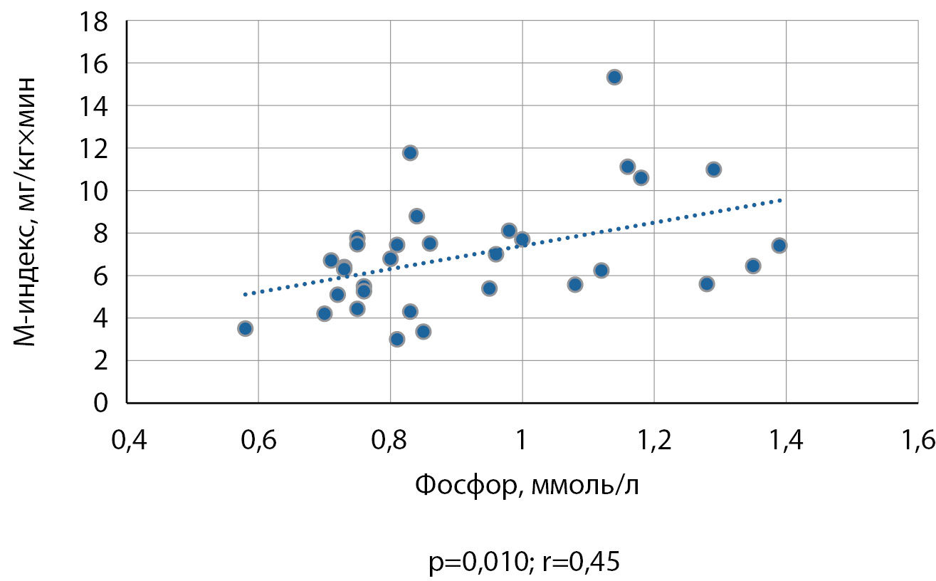 Рисунок 5. Взаимосвязь показателя М-индекса и уровня фосфора сыворотки.