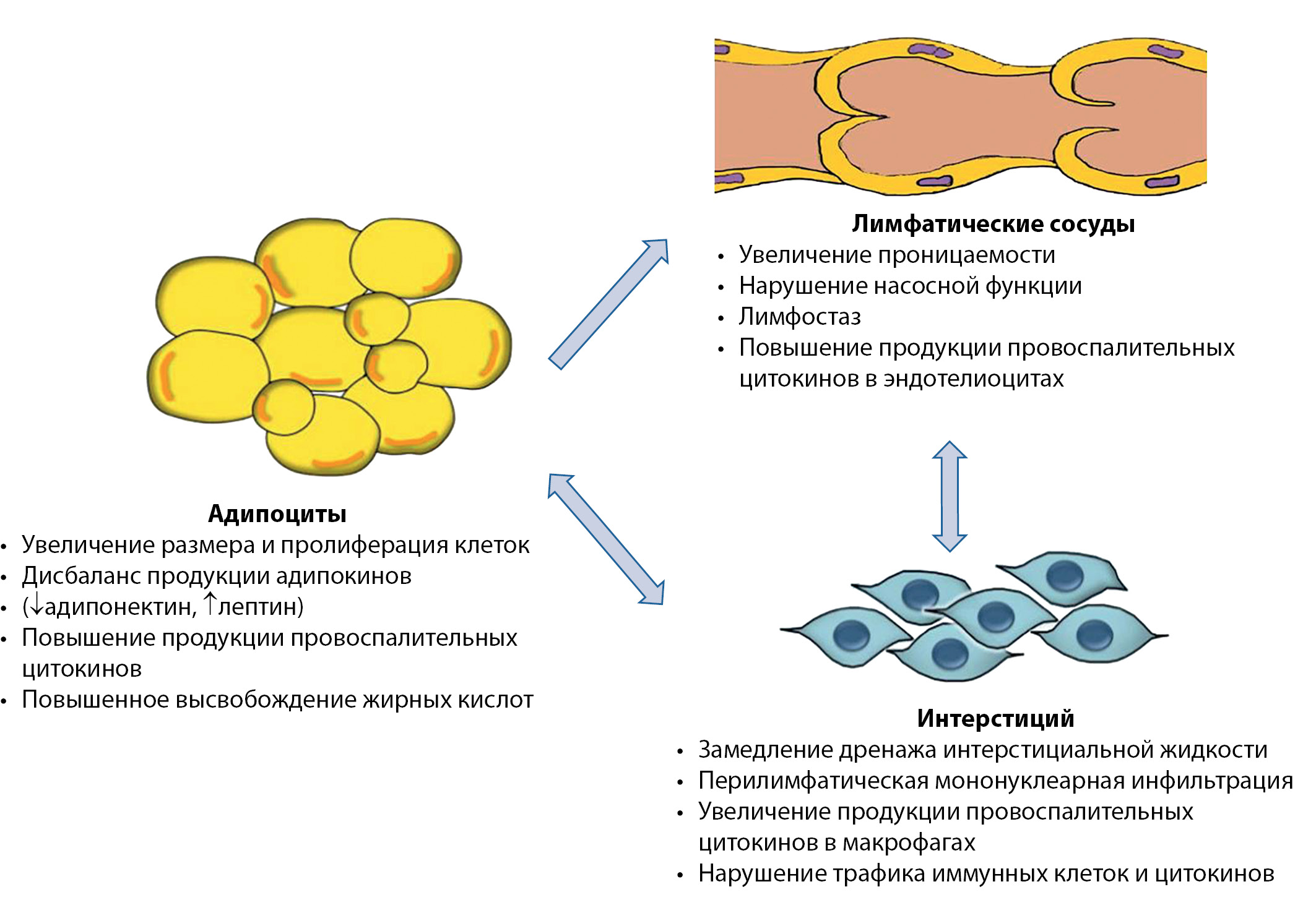 Взаимодействия между ЛС и ЖТ, наблюдаемые при лимфедеме, в определенной степени реализуются и при ожирении. Более полувека назад ожирение было идентифицировано как фактор риска развития вторичной лимфедемы у онкологических больных [32]. На моделях заболевания у грызунов показано, что ожирение характеризуется замедлением транспорта интерстициальной жидкости, нарушением насосной функции лимфатических коллекторов и перестройками архитектуры лимфатических узлов [33–35].У мышей с ожирением и сахарным диабетом 2 типа, имеющих дефект гена рецептора лептина (db/db), выявлено резкое увеличение проницаемости собирательных лимфатических сосудов [36]. Эти наблюдения согласуются с результатами клинических наблюдений, зафиксировавших снижение клиренса макромолекул из подкожной жировой клетчатки у лиц с ожирением. Интересно, что пероральная нагрузка глюкозой сопровождалась увеличением лимфатического дренажа ЖТ у лиц с нормальной массой тела; данный эффект отсутствовал у тучных пациентов [37]. В недавнем исследовании с лимфосцинтиграфией и забором интерстициальной жидкости показано, что ухудшение лимфатического дренажа подкожной ЖТ у женщин в пременопаузе ассоциировано со снижением чувствительности подкожных адипоцитов к адренергическим стимулам и со снижением липолиза [38]. Ультраструктурные изменения эндотелиоцитов лимфатических сосудов подкожной ЖТ, косвенно свидетельствующие о нарушении микроциркуляции и лимфатического дренажа, выявлены у лиц с ожирением и сахарным диабетом 2 типа [39].