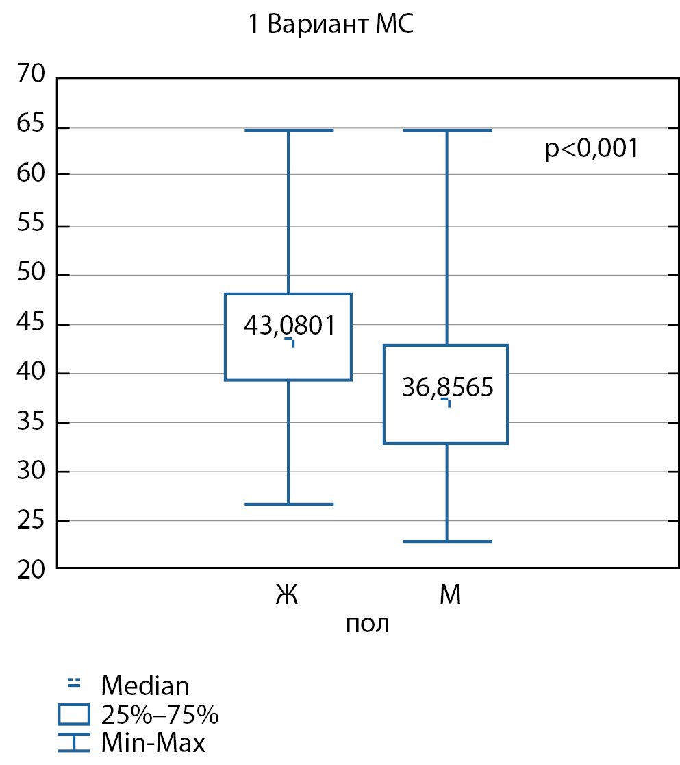 Рисунок 1. Частота выявления Варианта 1 МС в сравнении между мужчинами и женщинами (длительность проживания в условиях Крайнего Севера 1–5 лет).