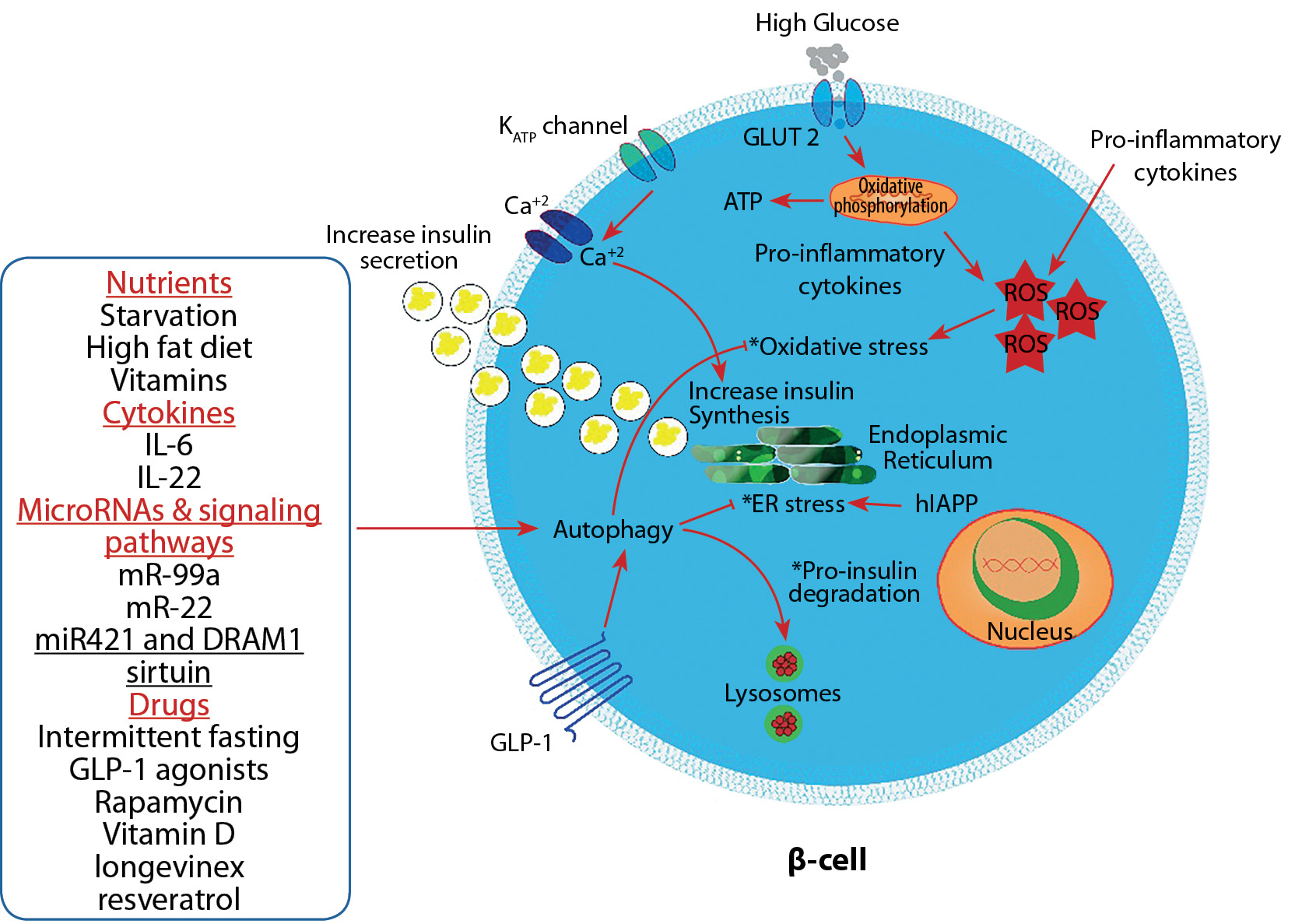 1. Figure 1. Autophagy’s role in maintaining Beta-cell mass and function through resolving the oxidative stress, endoplasmic reticulum (ER) stress, and reducing pro-insulin degradation (these functions indicated by asterisks).