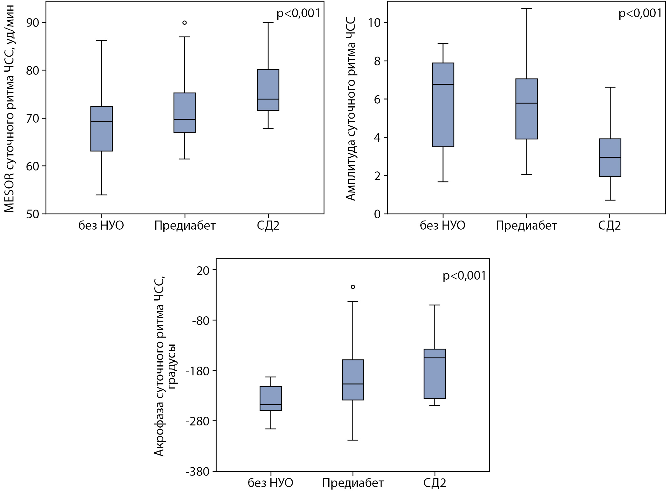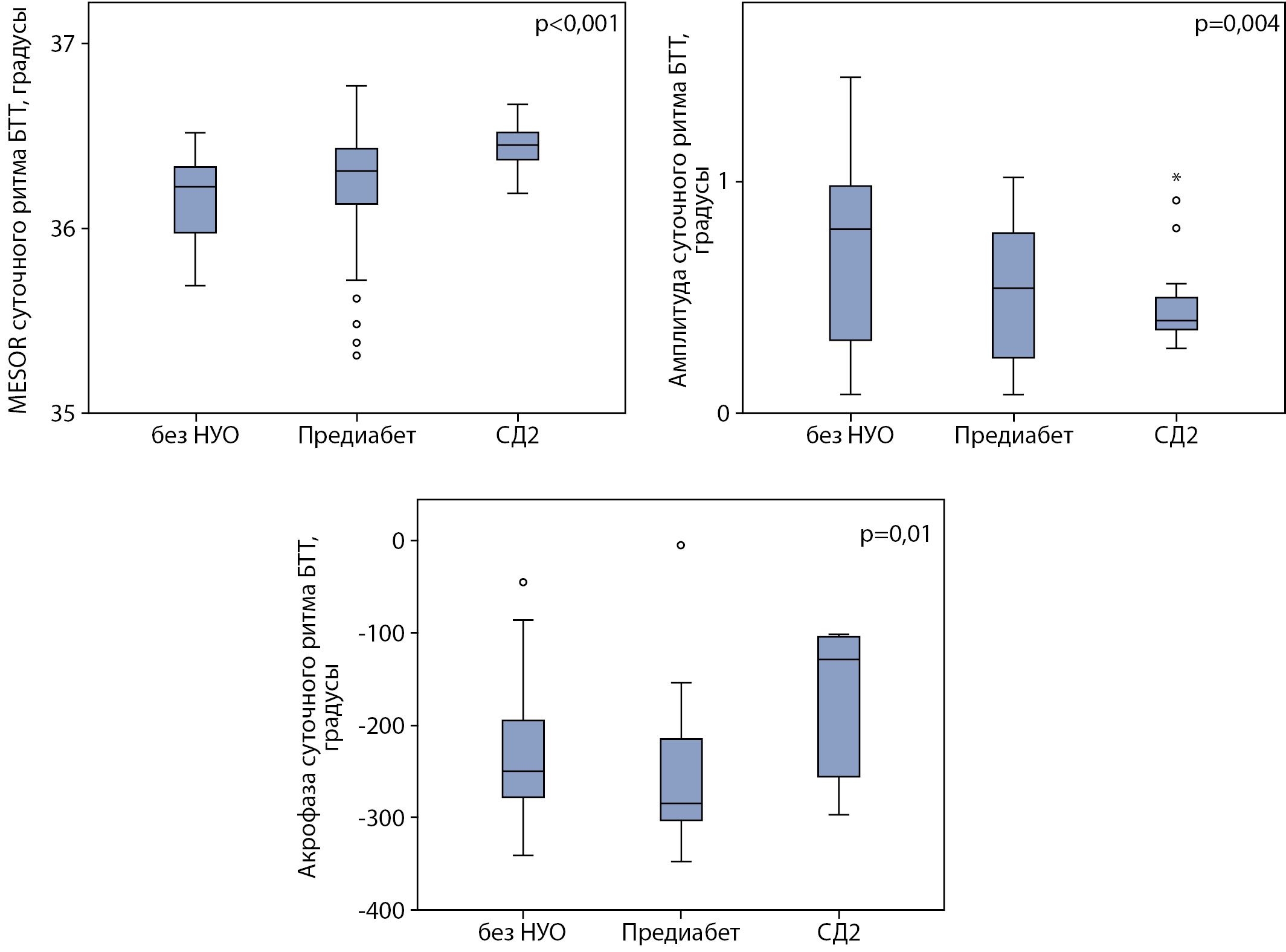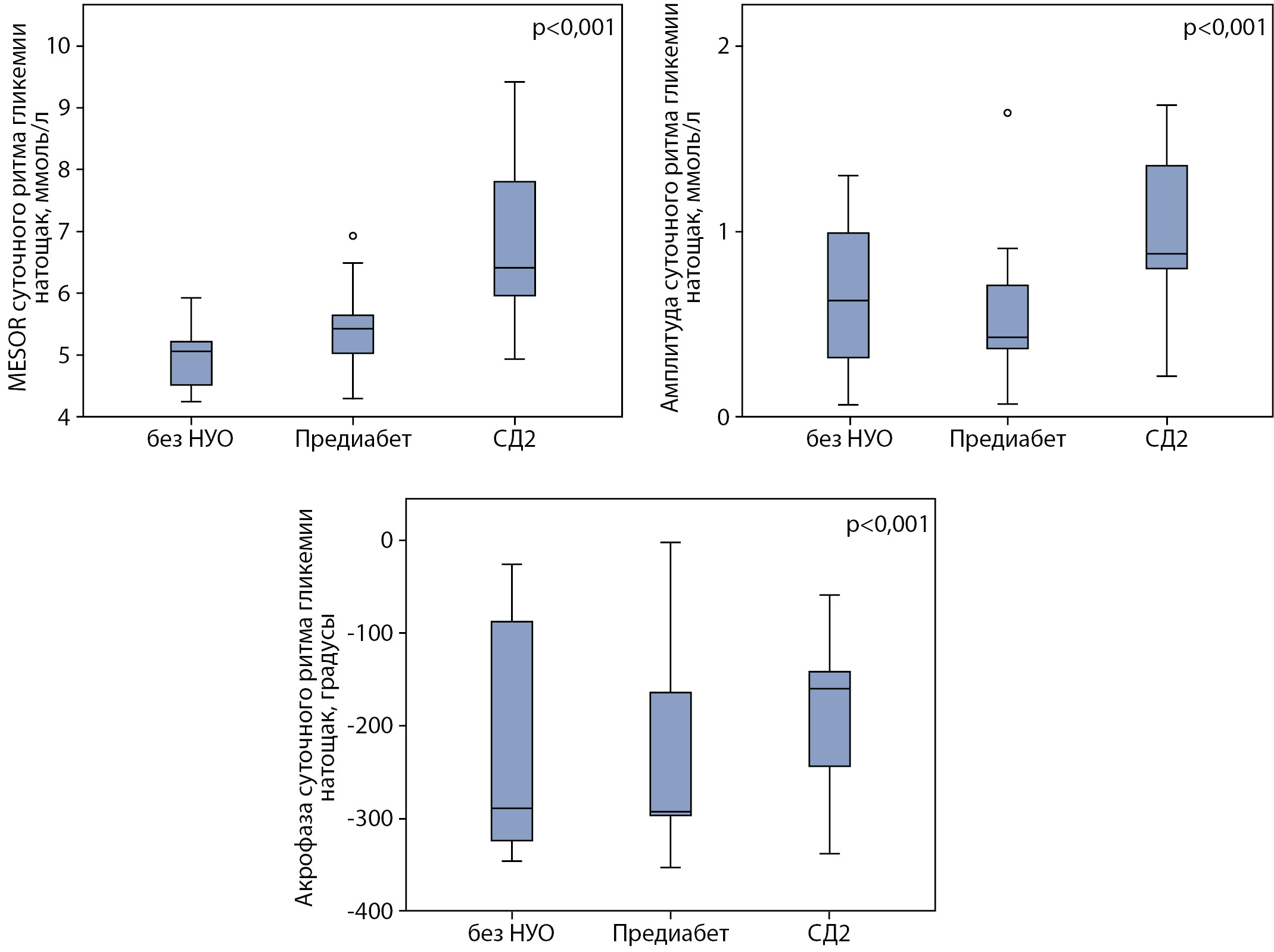Материалы и методы. Исследование проведено у лиц, имеющих висцеральное ожирение, а также наличие предиабета или СД2, со стажем заболевания не более 5 лет. В соответствии с дизайном исследования каждые 3 ч в течение суток участники в домашних условиях производили самостоятельные измерения гликемии (с помощью индивидуальных глюкометров), базальной температуры тела (БТТ) в подмышечной впадине (с применением ртутного термометра) и частоты сердечных сокращений (ЧСС) (с помощью электронного тонометра) с фиксацией результатов в дневниках самоконтроля. Оценку циркадианных ритмов изучаемых показателей осуществляли с использованием основных хронобиологических параметров (МЕSOR — Midline Estimating Statistic of Rhytm, амплитуды колебаний ритма, акрофазы — времени максимума функции) с помощью косинор-анализа с построением эллипсов доверия. Результаты. Из 120 участников исследования женщин было 73%, а мужчин — 27%. Средний возраст участников — 58,6 [52,2; 56,7] года, ИМТ — 31,3 [29,7; 33,9] кг/м2 и наличие висцерального ожирения — объем талии 100 [93,8; 104,7] см. При проведении косинор-анализа суточные ритмы физиологических показателей гликемии натощак, БТТ и ЧСС имеют отличия от нормальных уже в группе с висцеральным ожирением без нарушений углеводного обмена и предиабетом в виде сокращения амплитуды суточных ритмов (р<0,001) со смещением их акрофаз (р<0,001), отсутствия динамики снижения ночной БТТ (р<0,001).